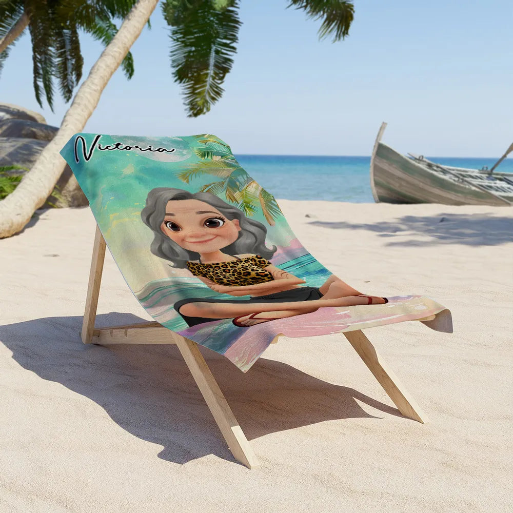 Personalized Beach Towel with Cartoon Girl – Summer Beach Gift for Her, Custom Name Towel for Vacation and Pool Days
