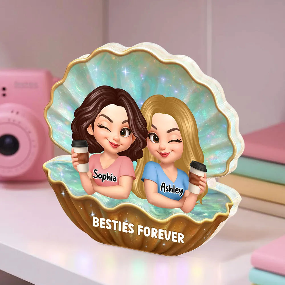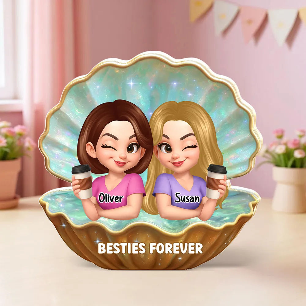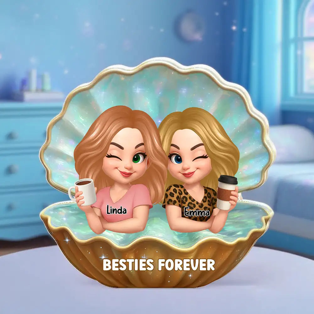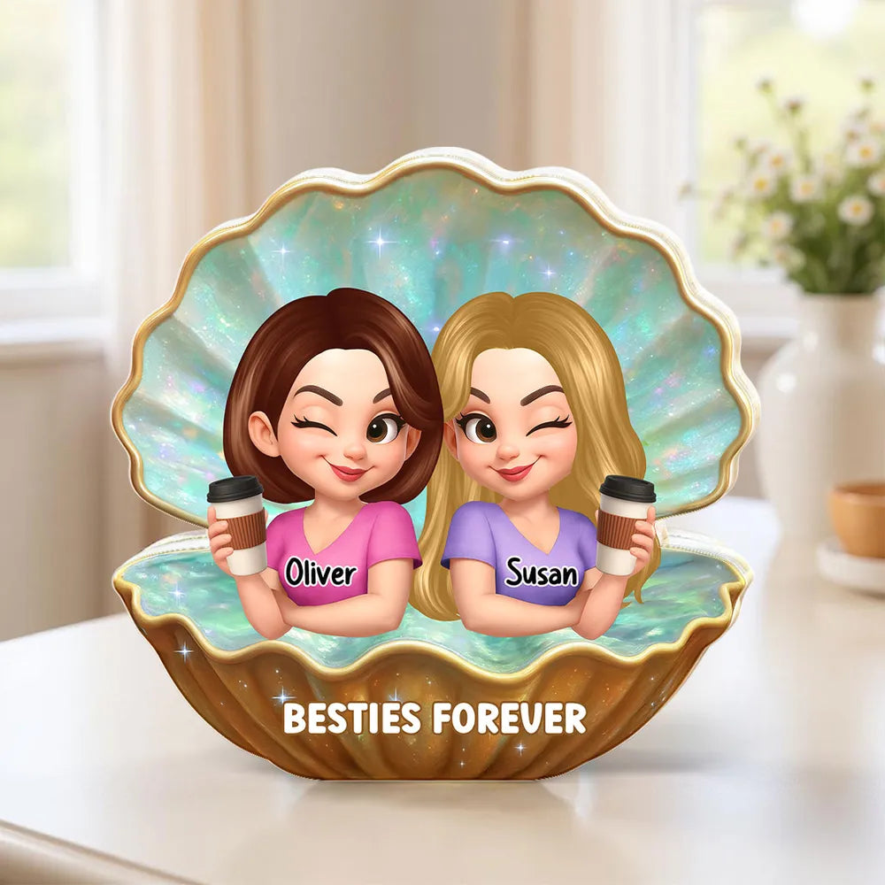 Celebrate the bond of friendship with this adorable personalized acrylic block plaque. Designed with two best friends holding coffee cups, this fun and custom piece brings out the joy and uniqueness of your relationship. Whether displayed on a desk or bookshelf, it will always remind you and your bestie of the memories you've shared.