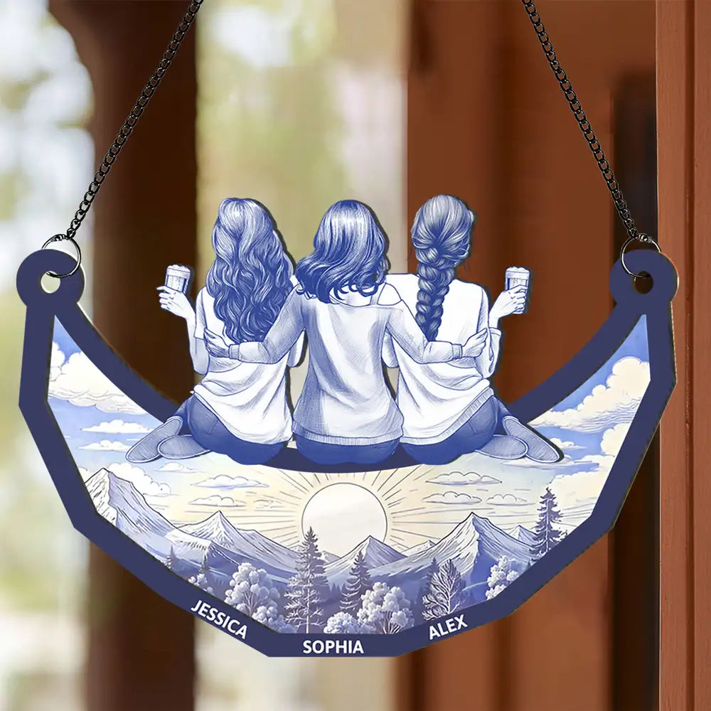 This wood and acrylic layered ornament features the back view of sisters with a mountain sunrise background, symbolizing strength and togetherness in a vintage style.