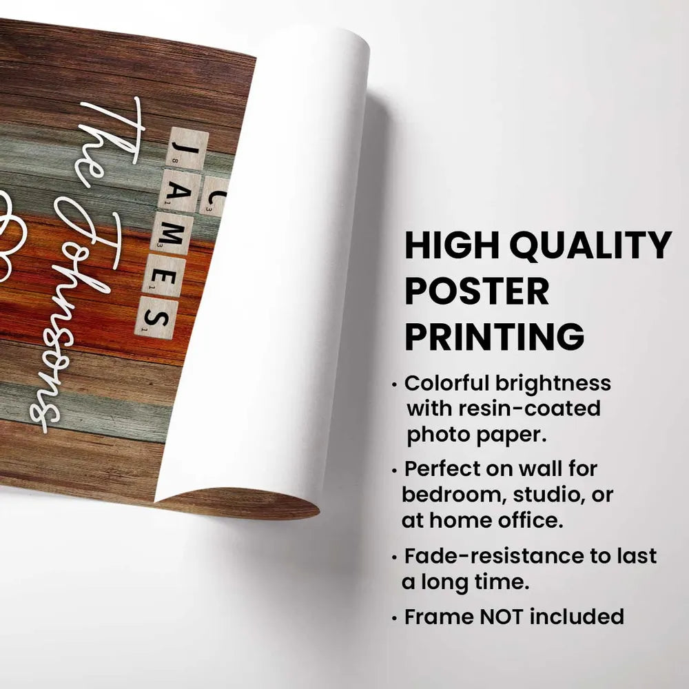 The intersecting names and colorful wood-style background give this poster a charming, bookshelf-ready look. Display it in the living room, hallway, or entryway as a daily reminder of the love you share and the story you are building together.