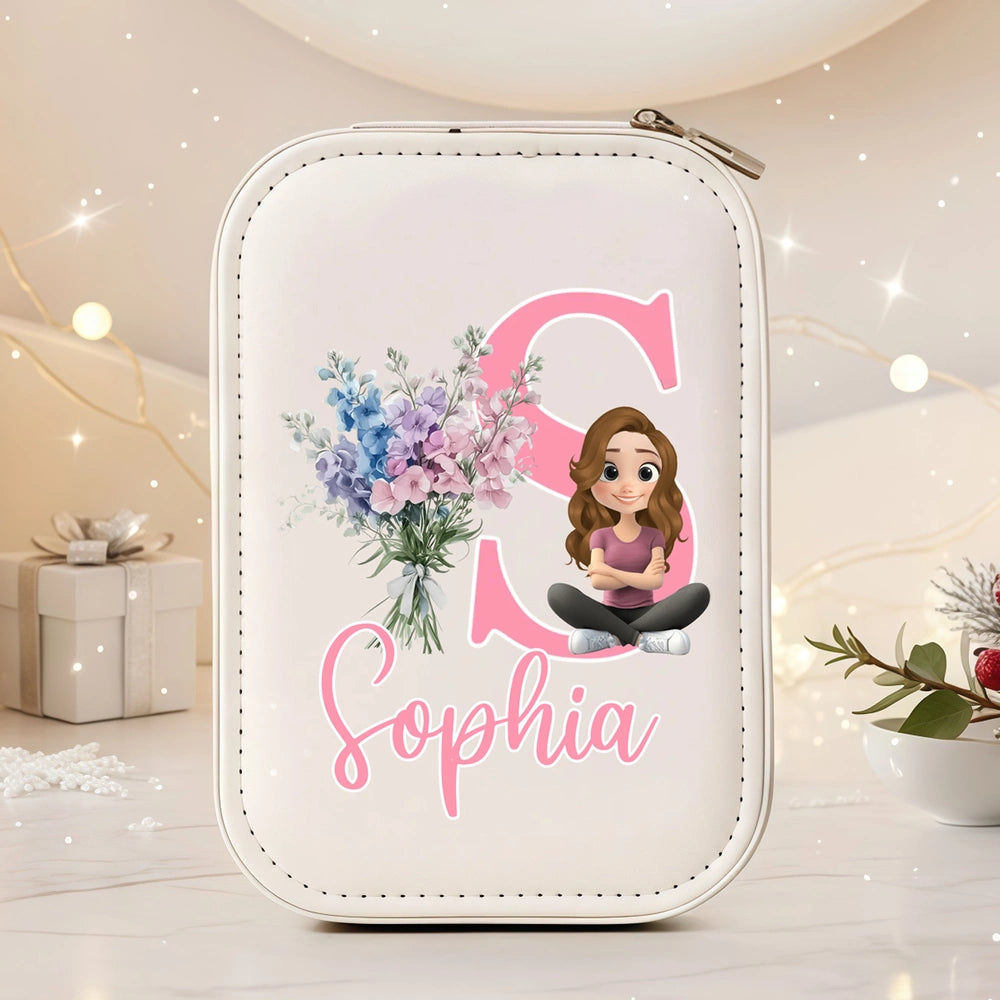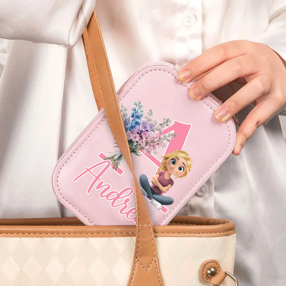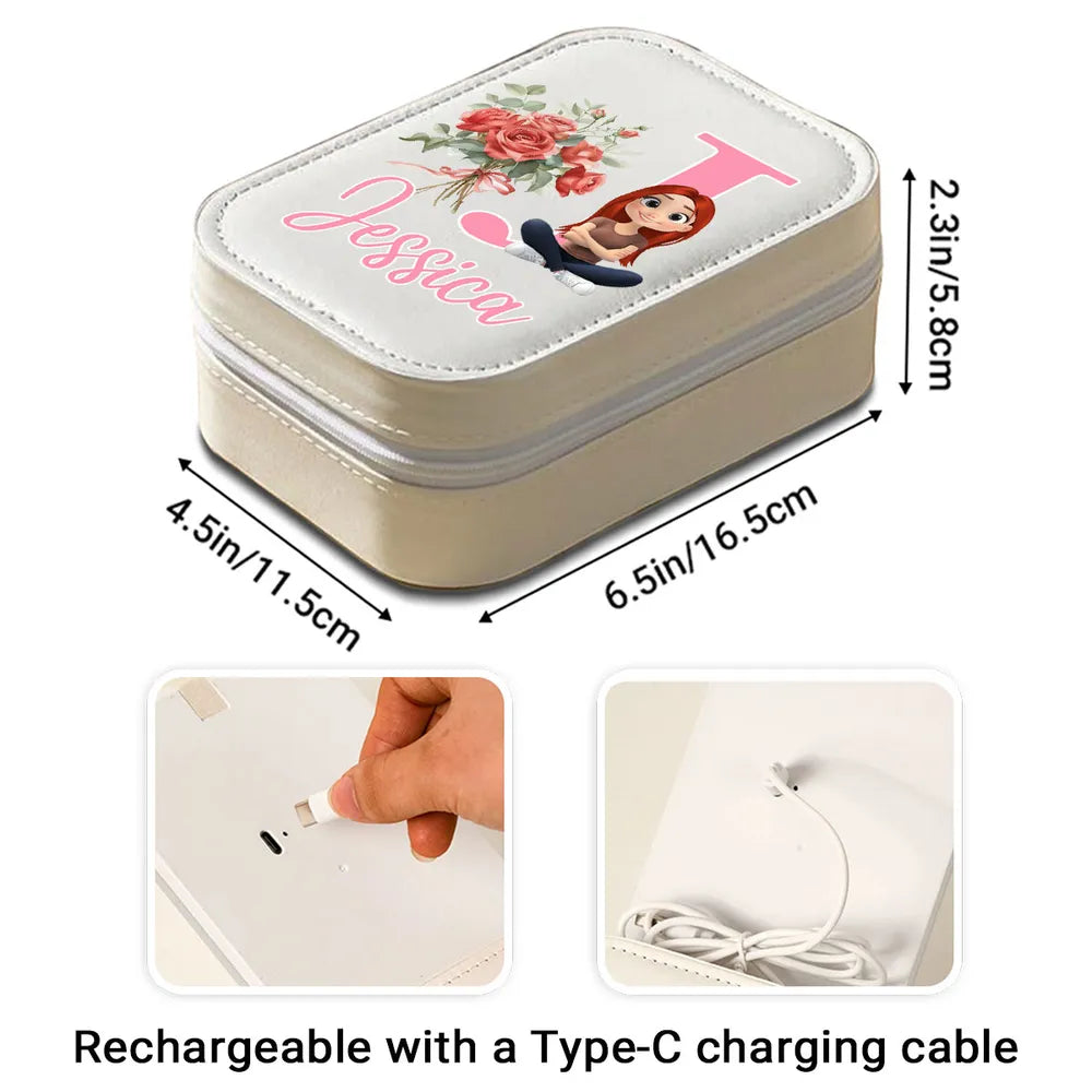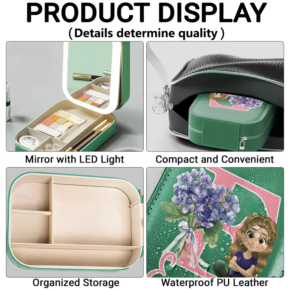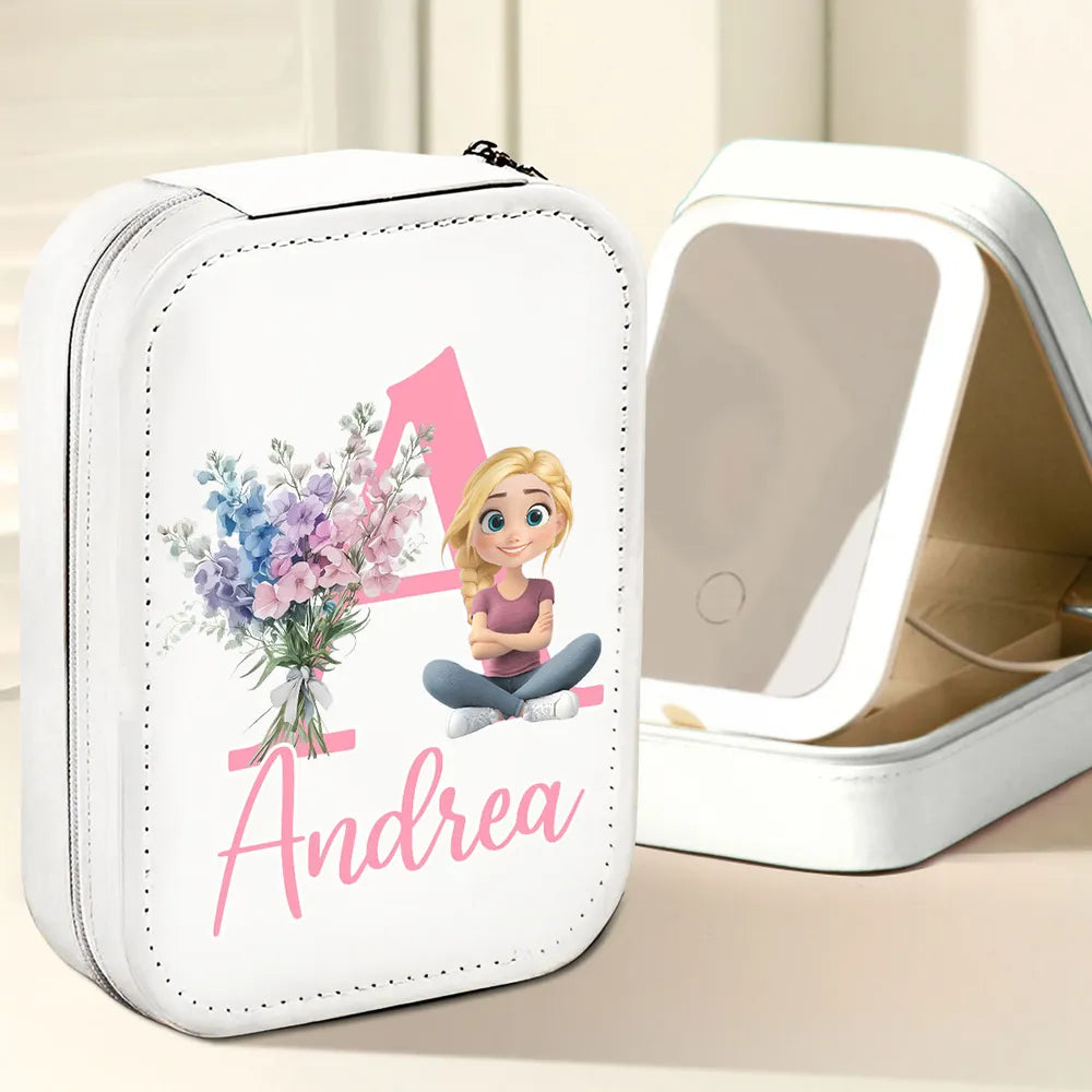 Personalized Leather LED Makeup Case with Cartoon Girl & Florals, Unique Gift for Teens & Daughters