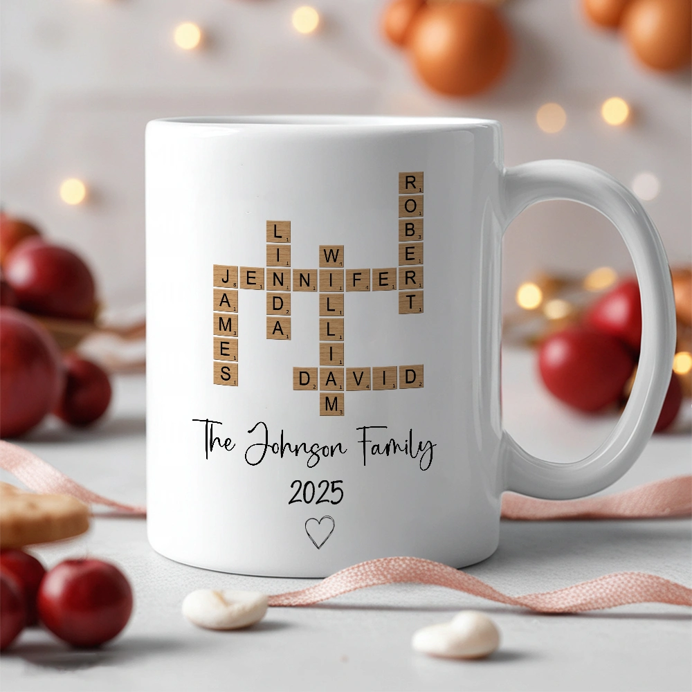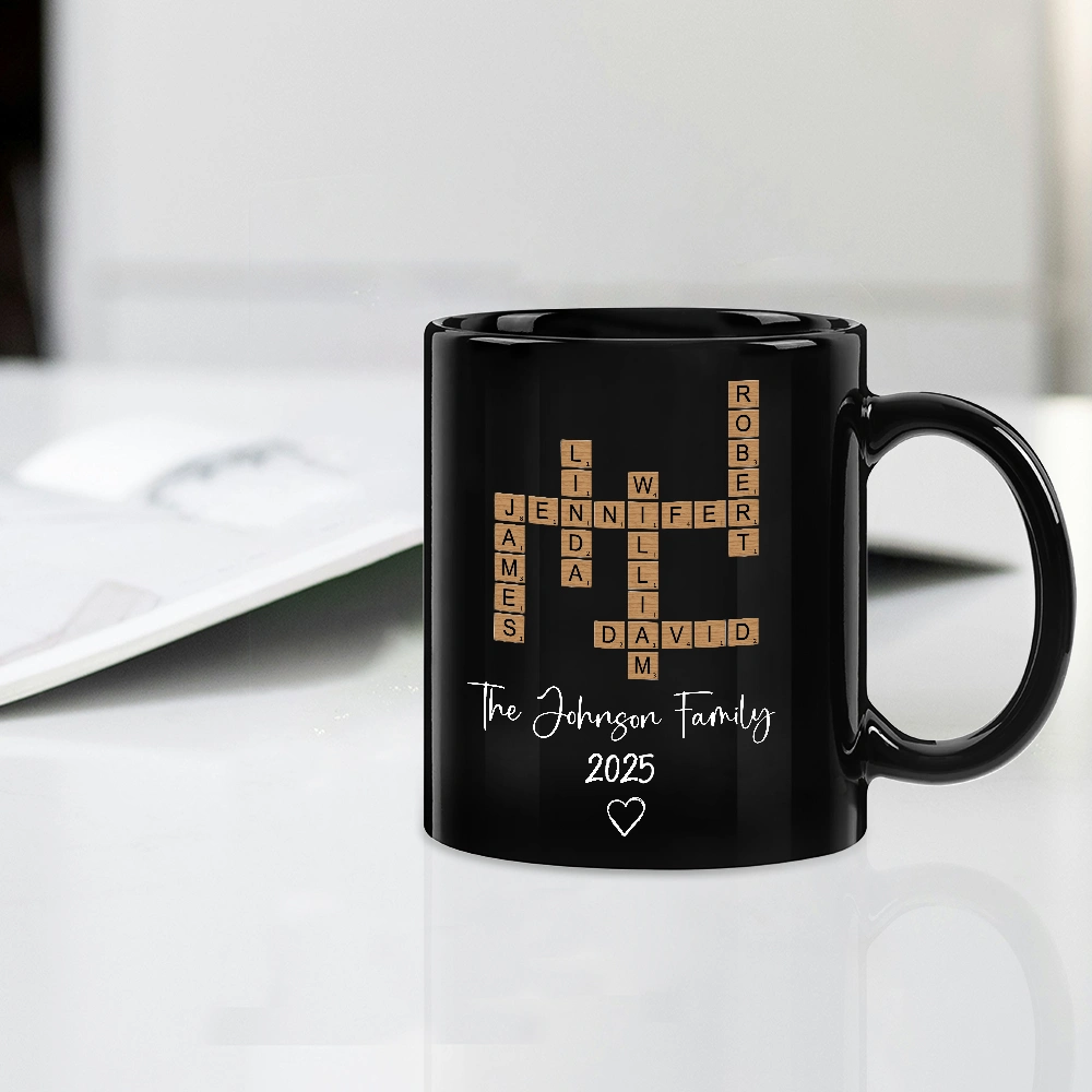 Create a personalized white ceramic mug that celebrates your whole crew. The playful crossword layout turns your family names into a creative design, making every sip of morning coffee or daily tea feel extra special.
