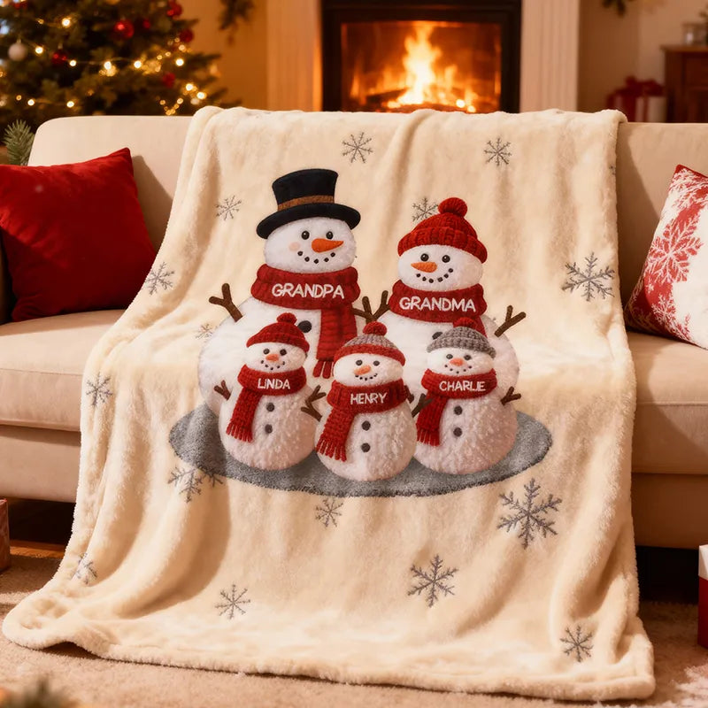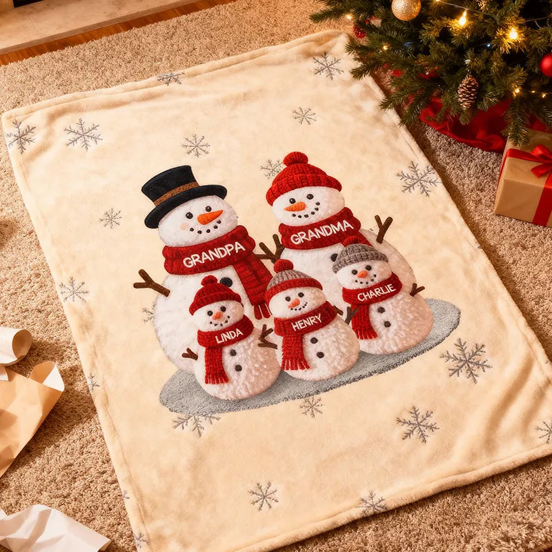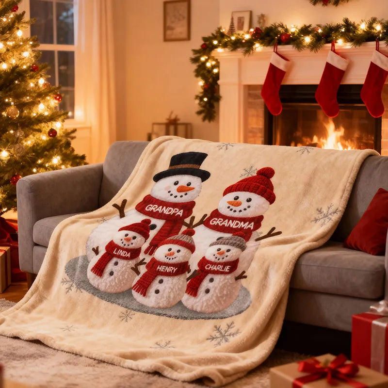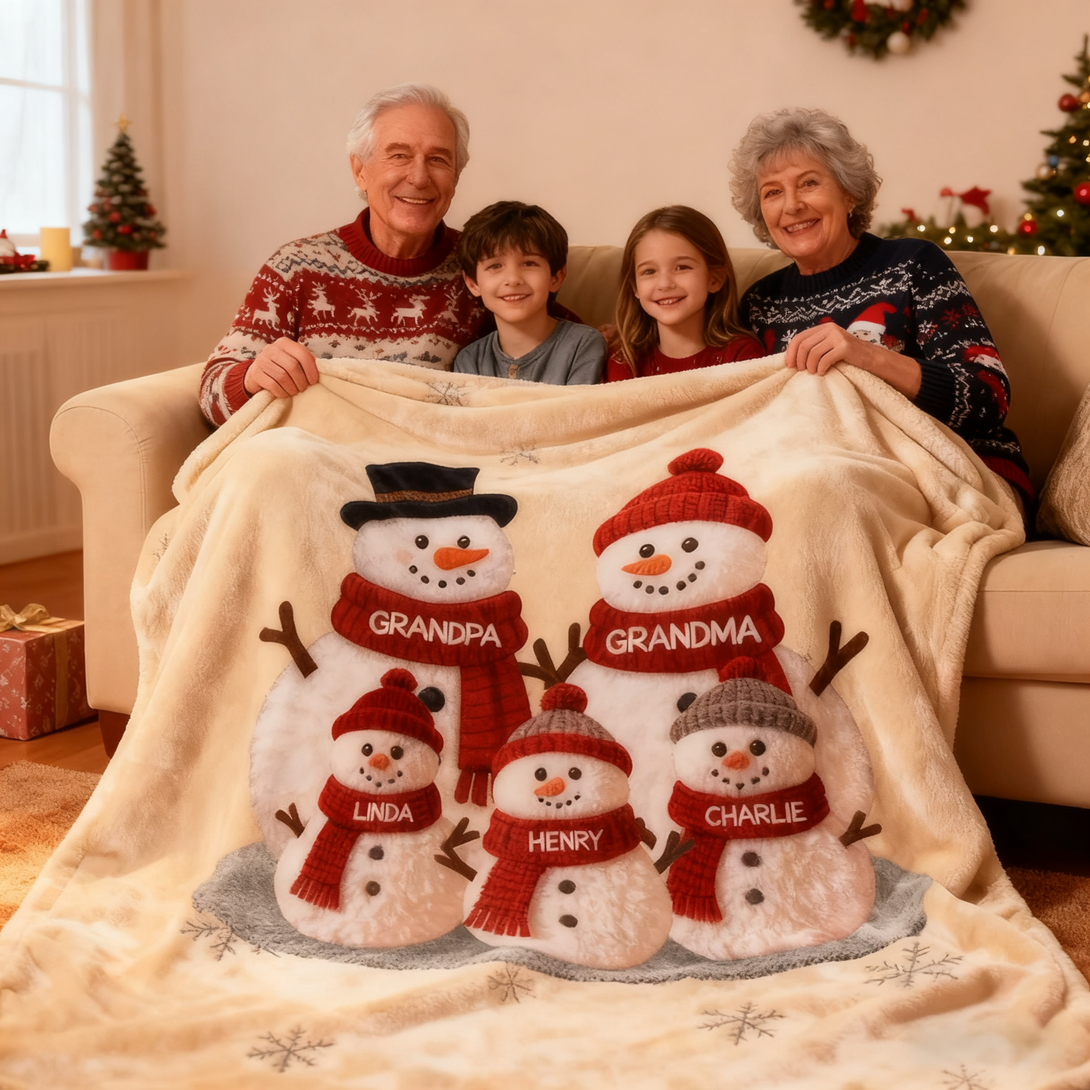 Custom Snowman Family Fleece Blanket, Snuggly Holiday Fleece for Grandma and Grandpa, Unique Personalized Christmas Gift