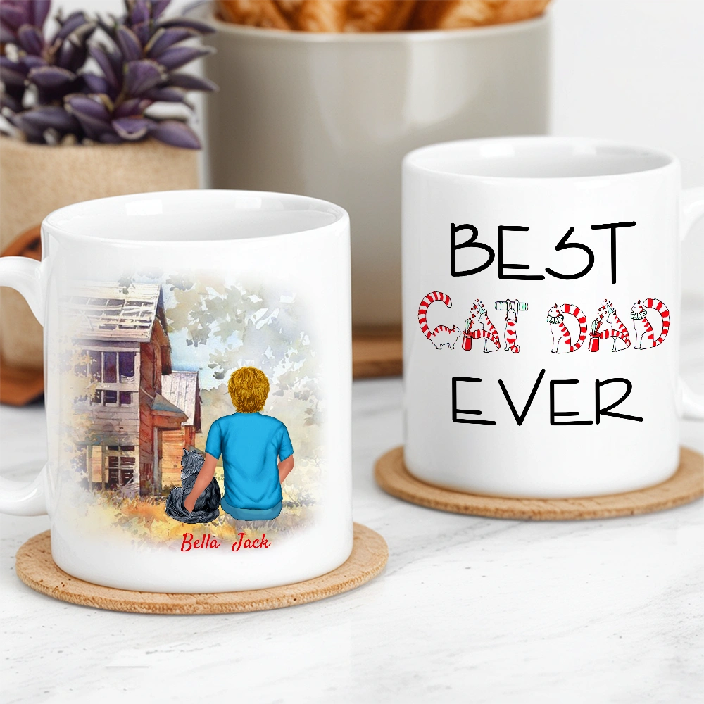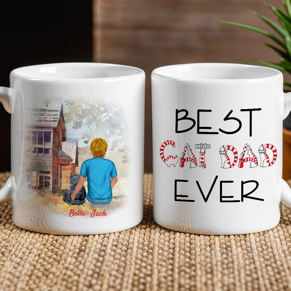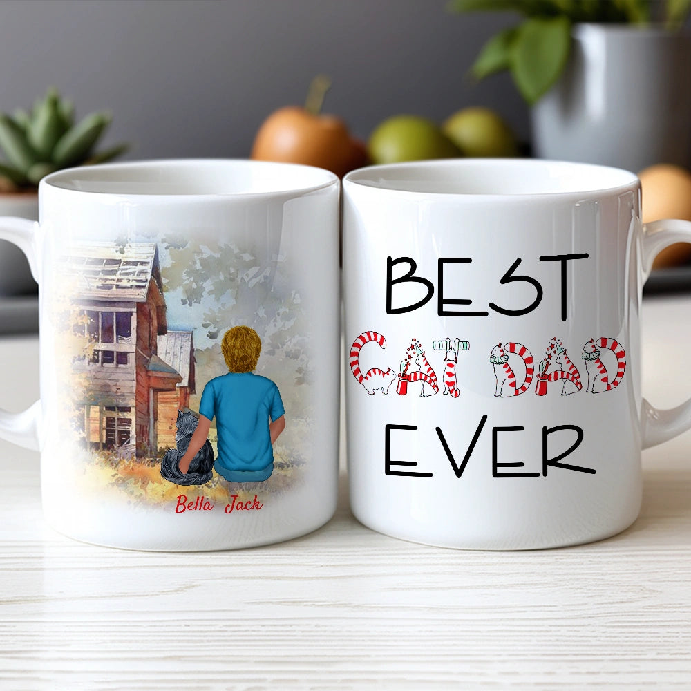 Best Cat Dad Ever Personalized White Ceramic Mug with Cat Illustration, Cozy Scene & Unique Gift for Pet Lovers