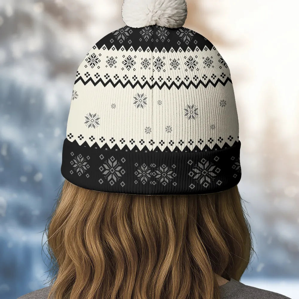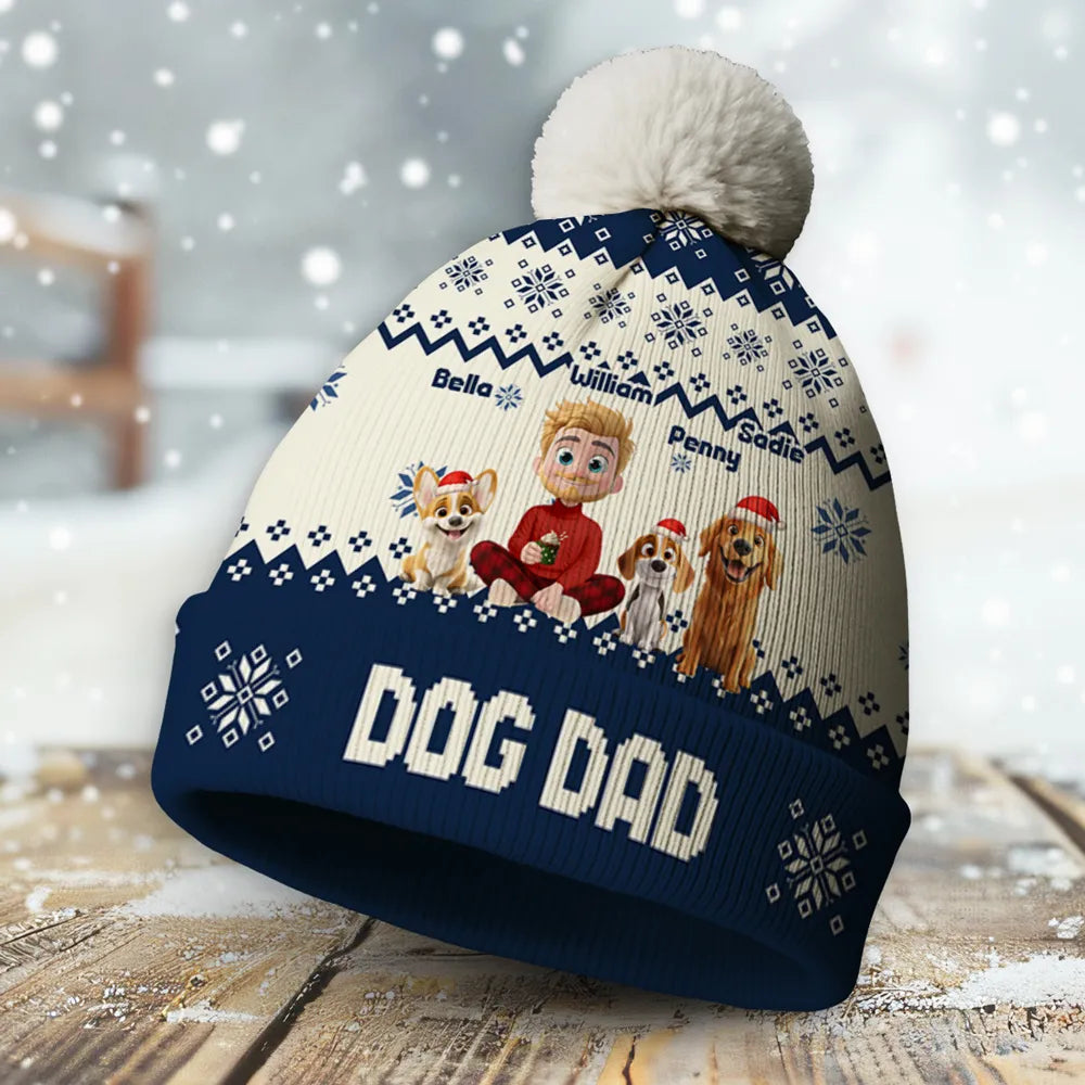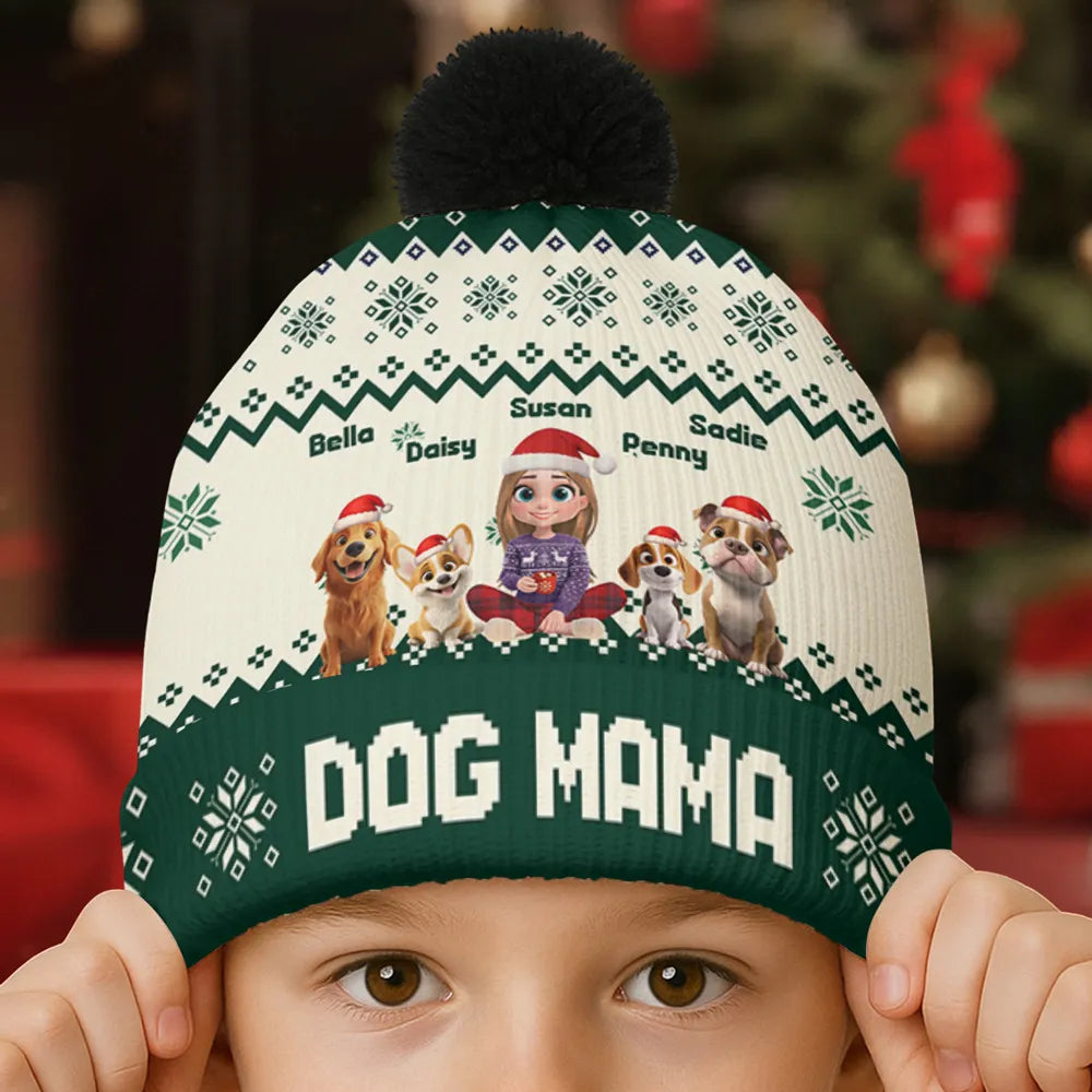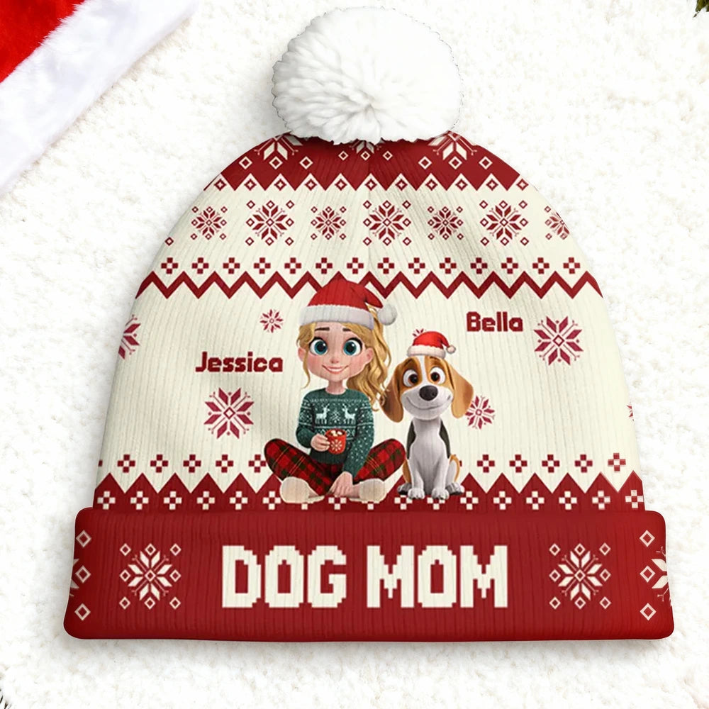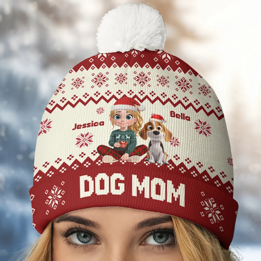 Personalized Bobble Beanie Hat for Dog Mom with Cartoon Woman & Pup – Cozy Christmas Style, Unique Gift for Pet Lovers