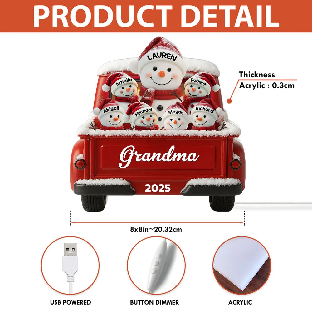 Custom Snowman Grandma & Grandkids Acrylic Light Box, Festive Red Truck Bedroom Lamp and Unique Holiday Gift for Family