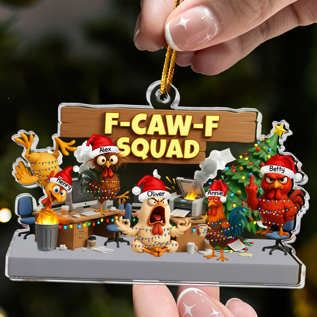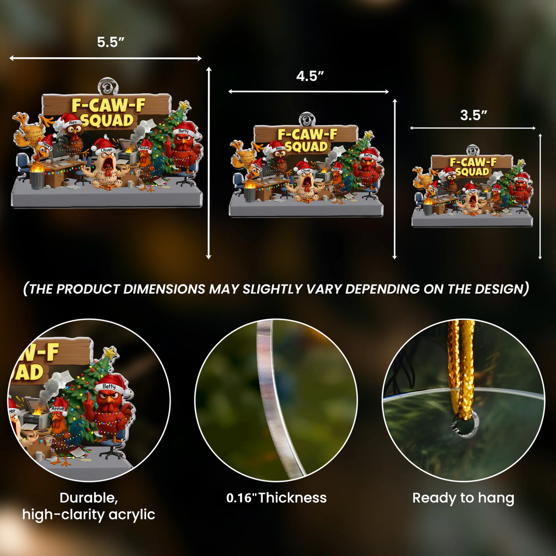 Custom F-Caw-F Squad Acrylic Ornament with Hilarious Office Chickens Christmas Tree Scene Unique Secret Santa Gift for Work Friends