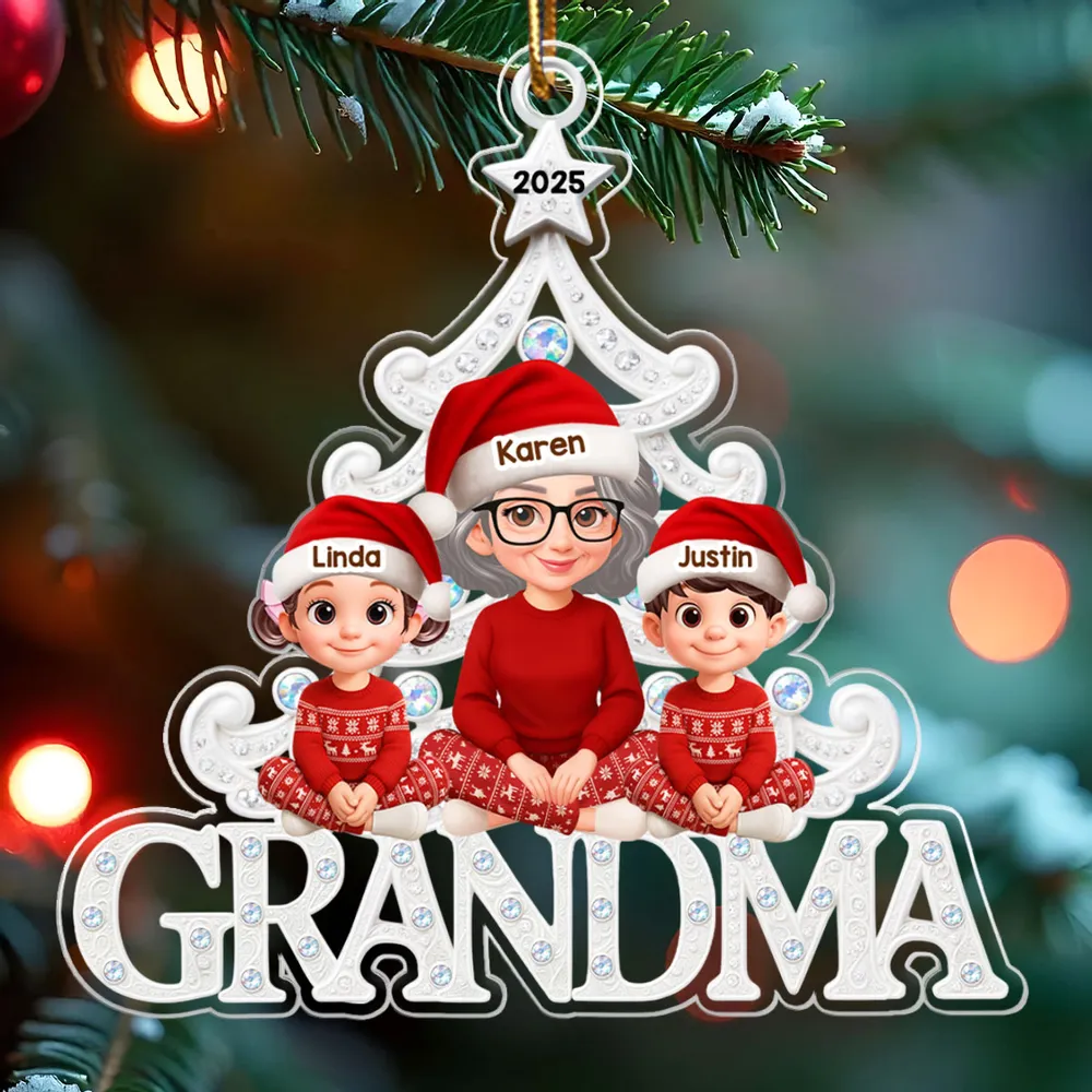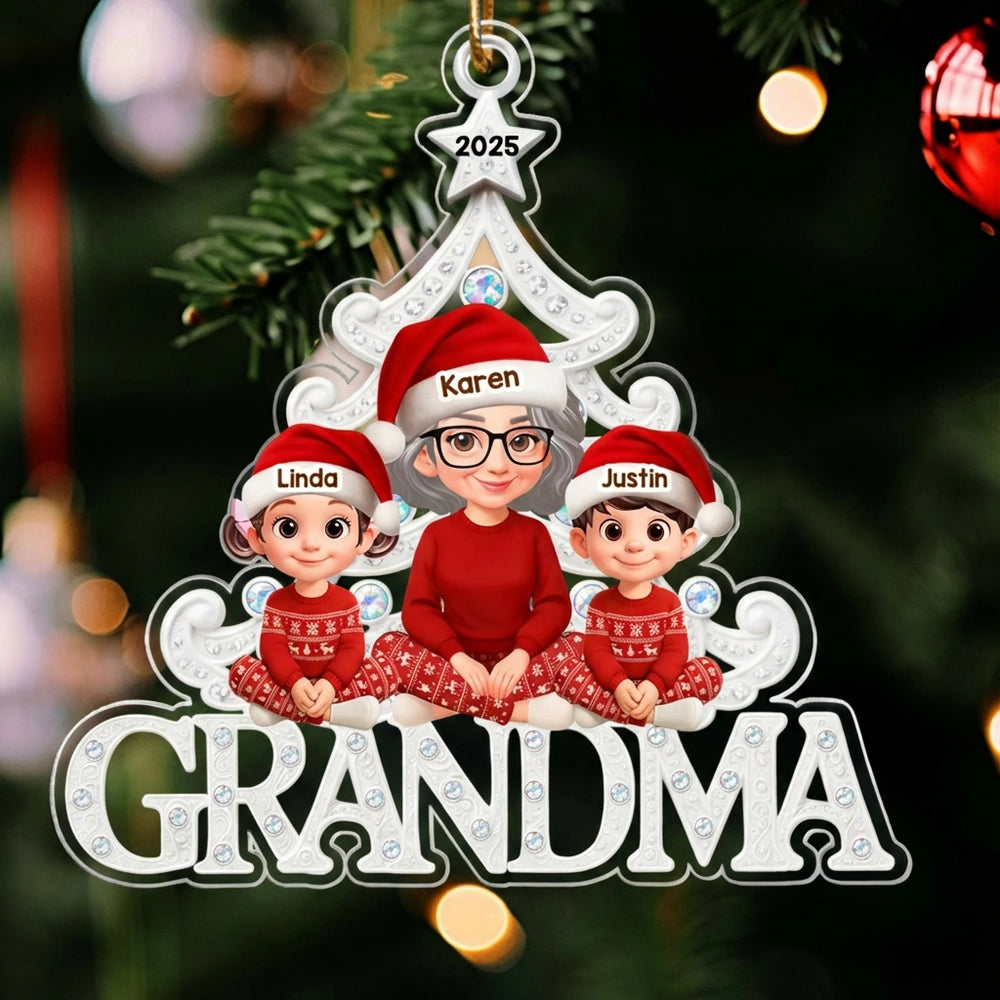 Custom Grandma Acrylic Ornament with Grandchildren in Santa Hats, Adorable Christmas Keepsake and Unique Family Gift