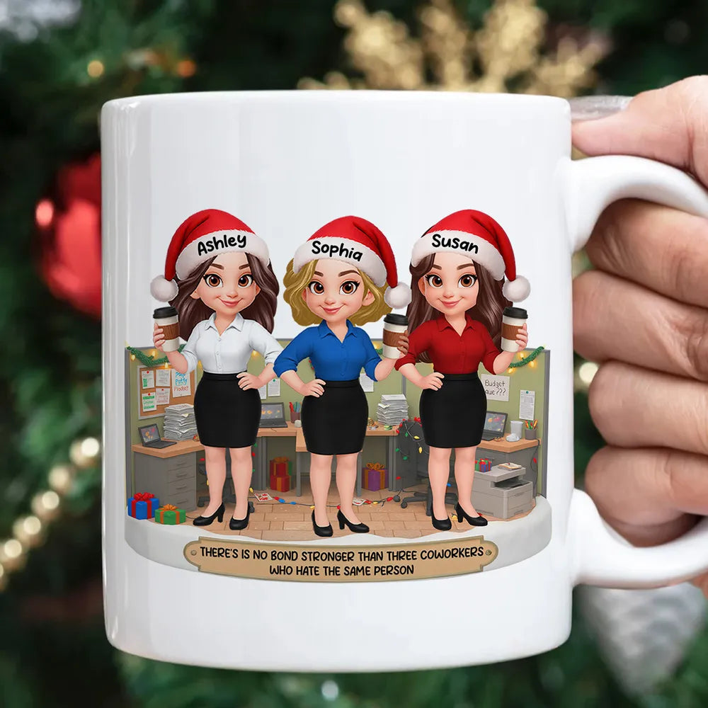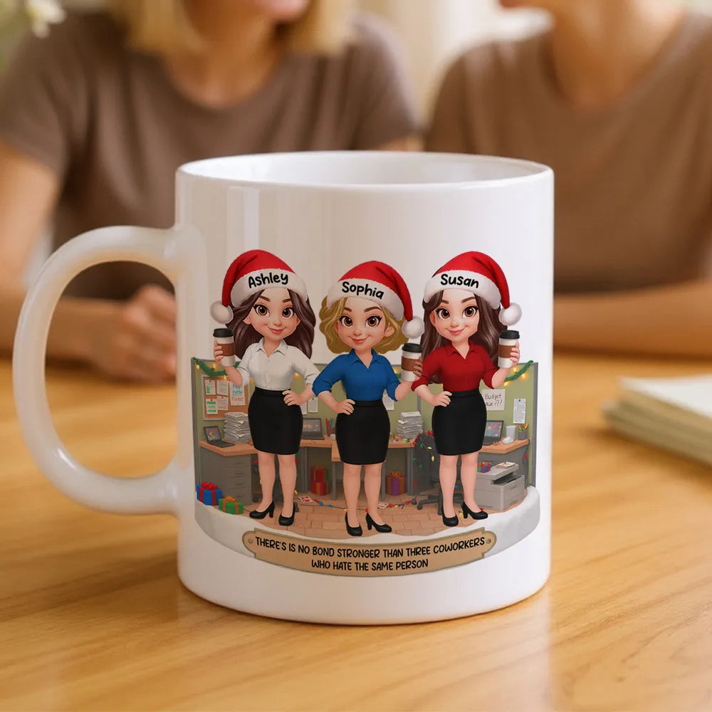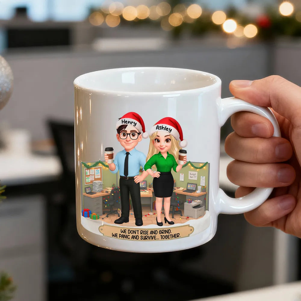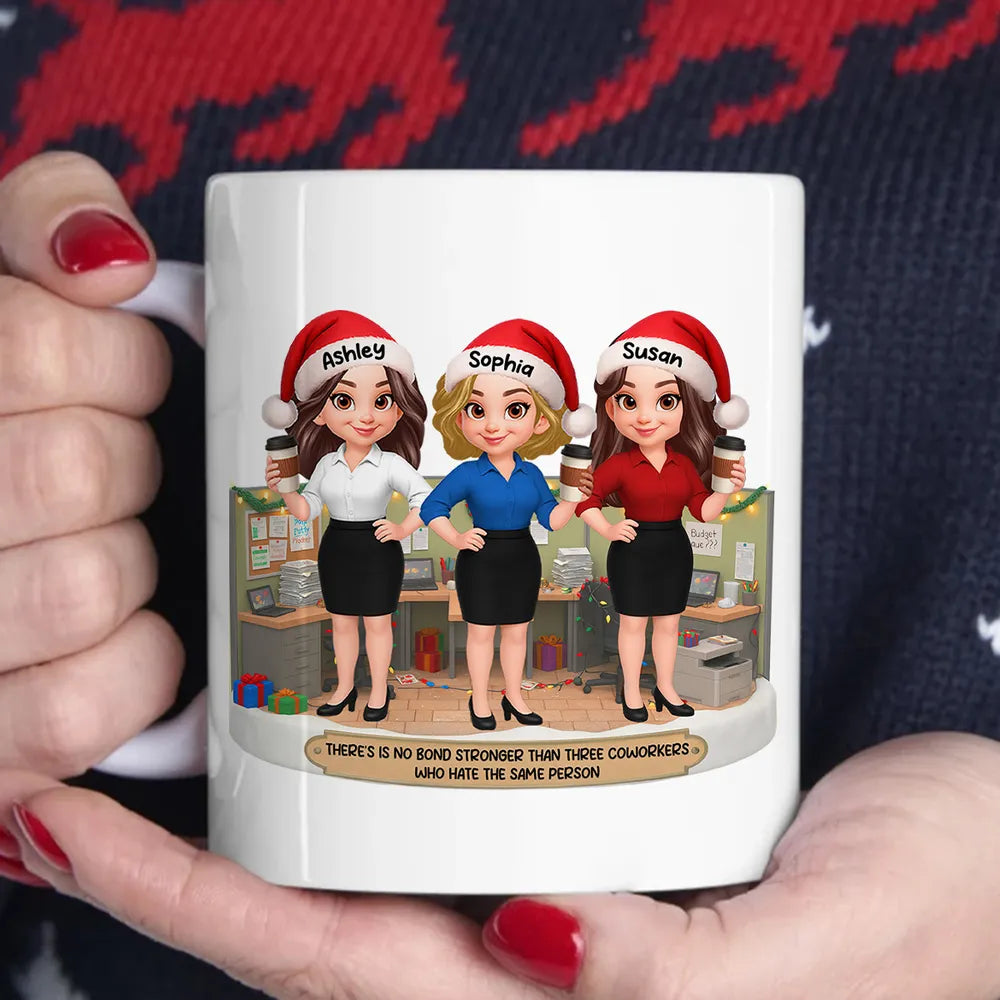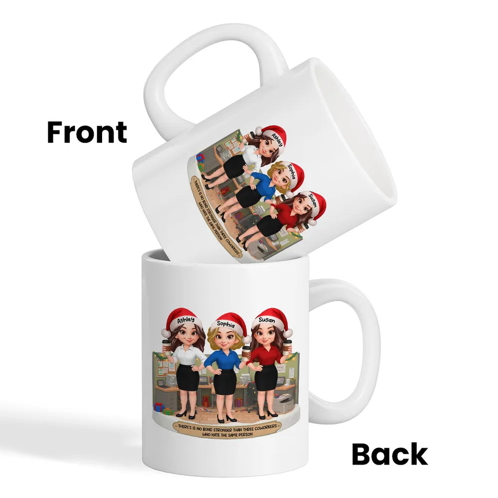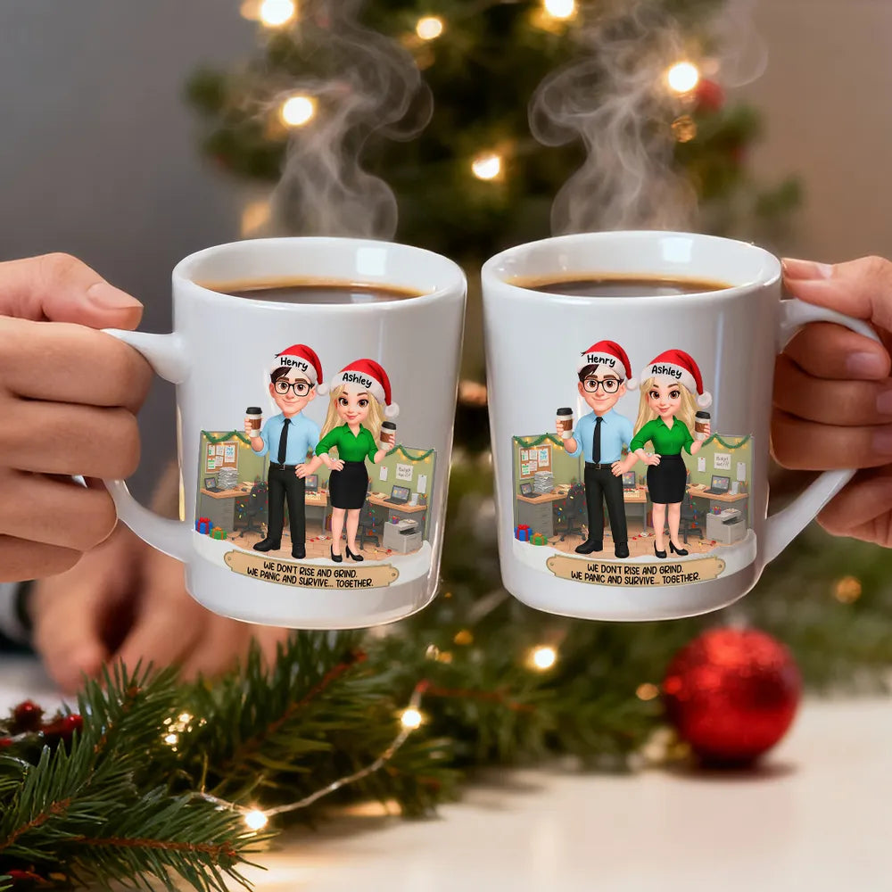 The cute cartoon coworkers in Santa hats, coffee in hand and holiday decor in the background, perfectly capture that shared "we survive this place together" energy. Every sip of morning coffee or daily tea brings back your funniest office moments.