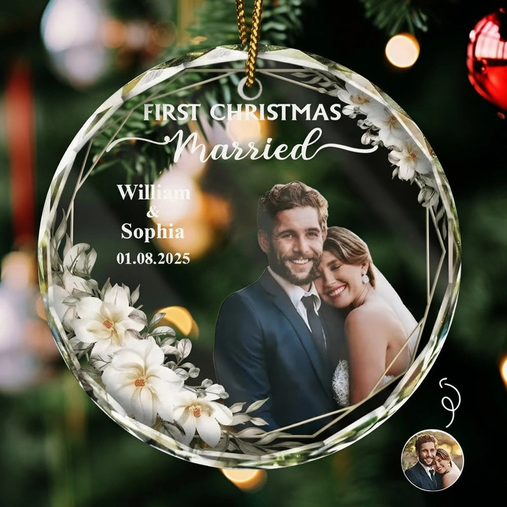 Personalized Crystal Ornament for First Christmas Married – Custom Photo Couple Keepsake, Romantic Holiday Tree Gift