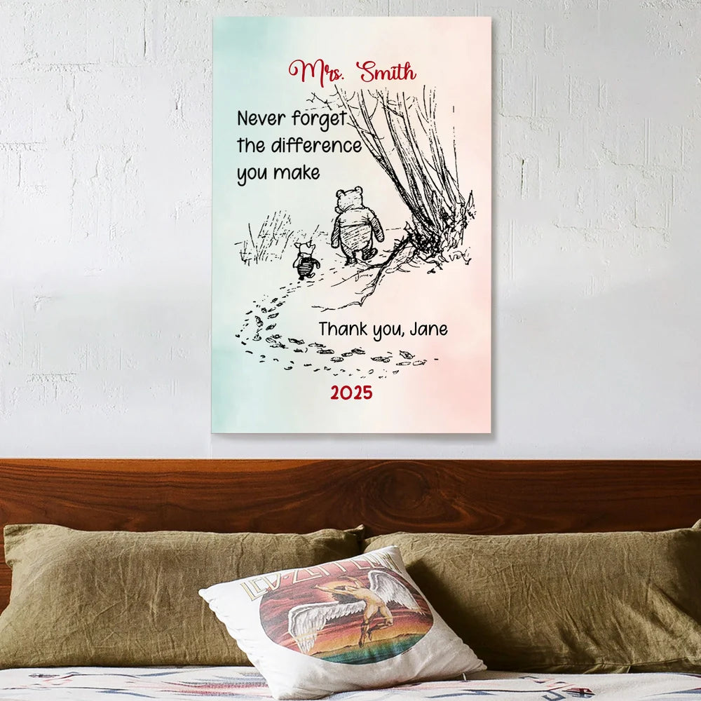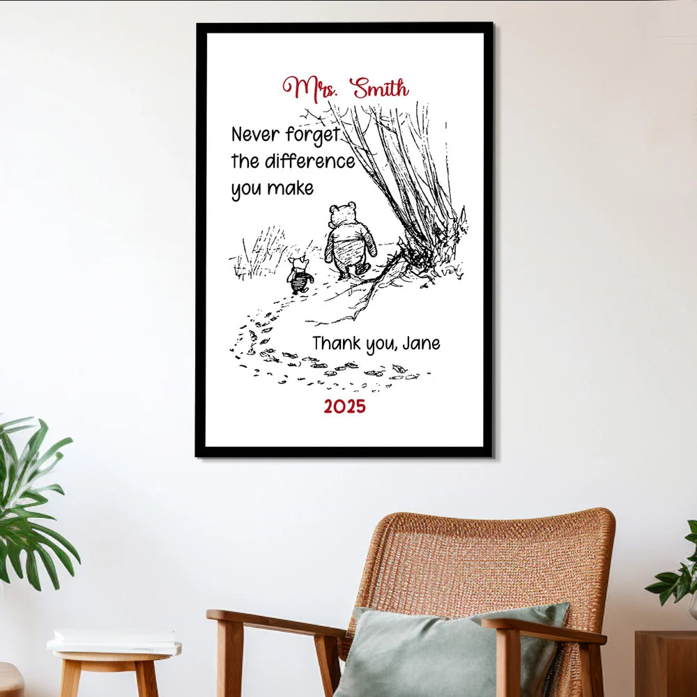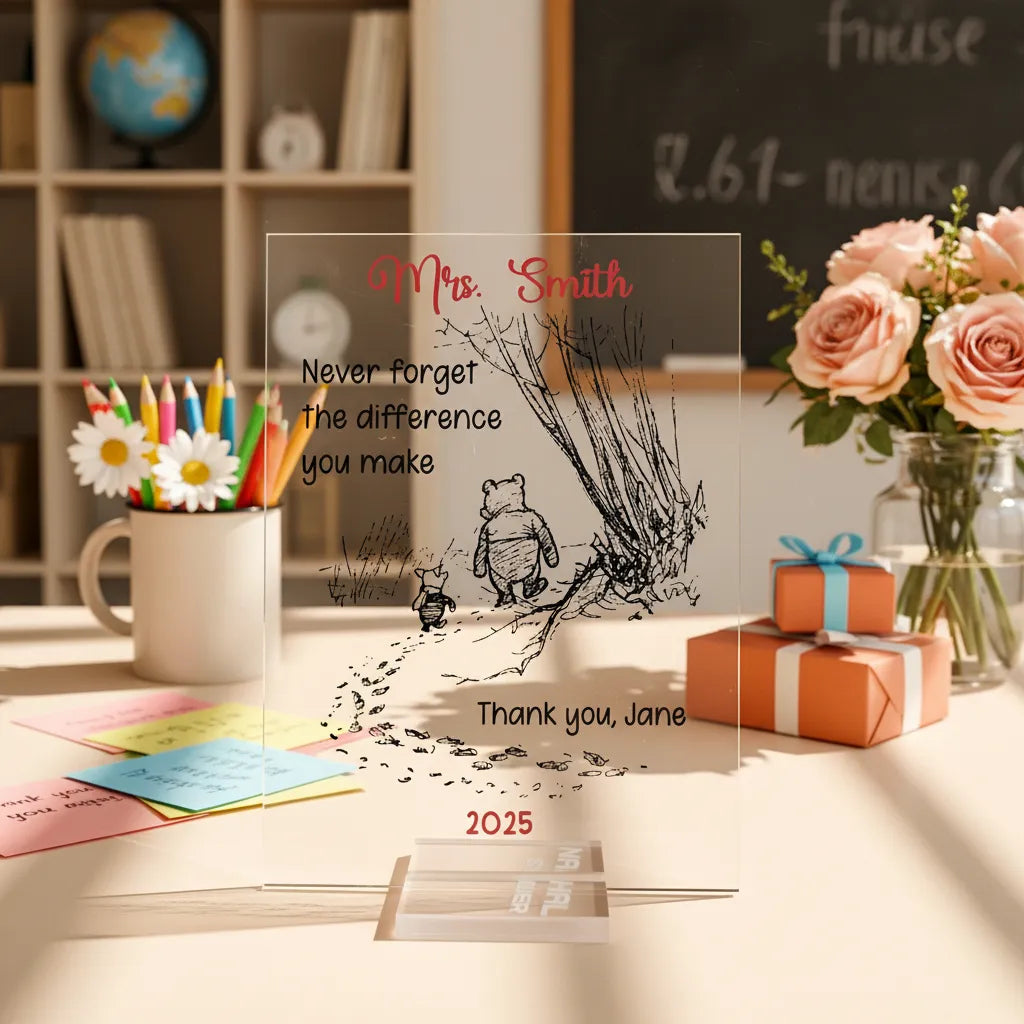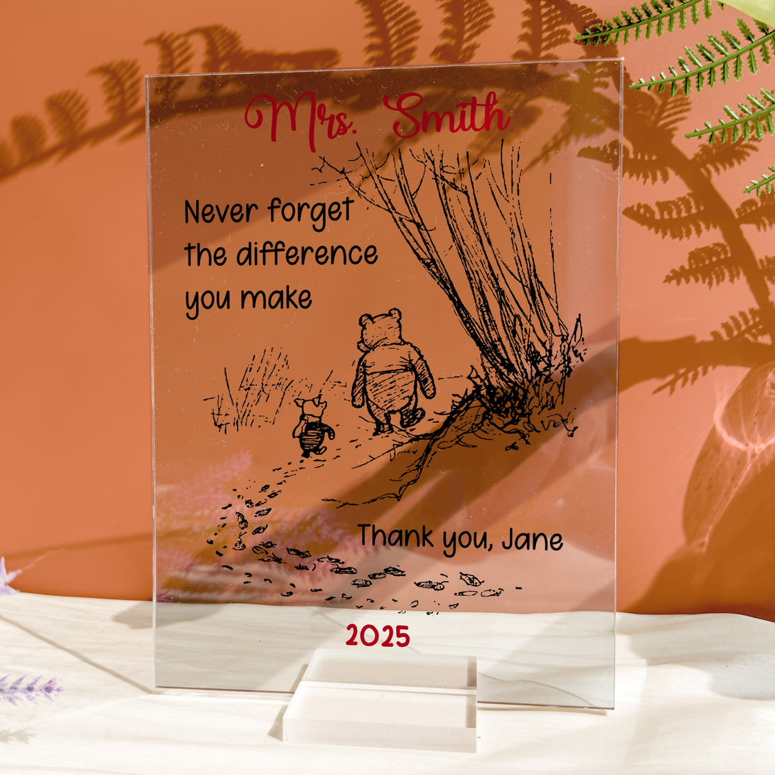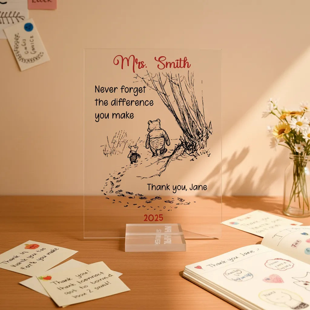 This custom acrylic plaque turns a simple thank you into a lasting keepsake. Add your own names and year around the sweet walking illustration and heartfelt Never forget the difference you make quote for a gift that feels truly one of a kind.