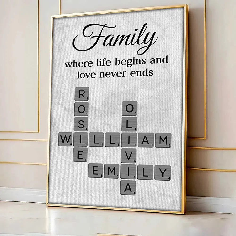 This personalized family poster turns your loved ones names into a crossword around the word Family, with the quote where life begins and love never ends. It is a simple, thoughtful way to celebrate the people who mean everything.