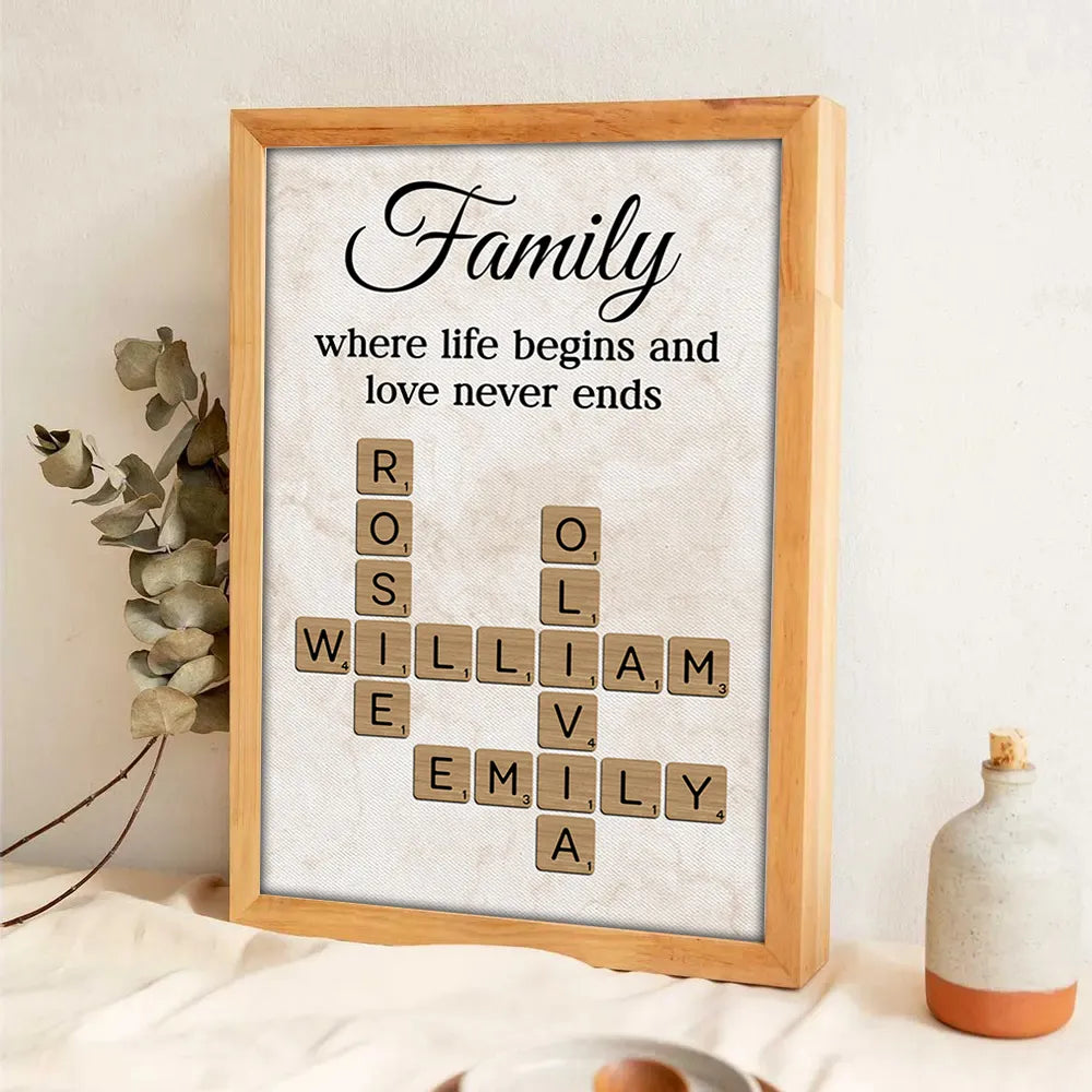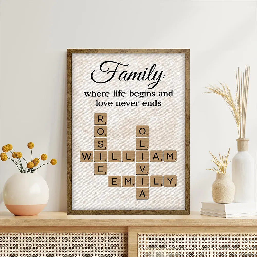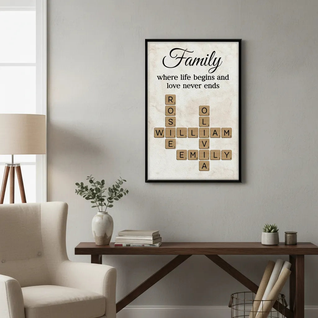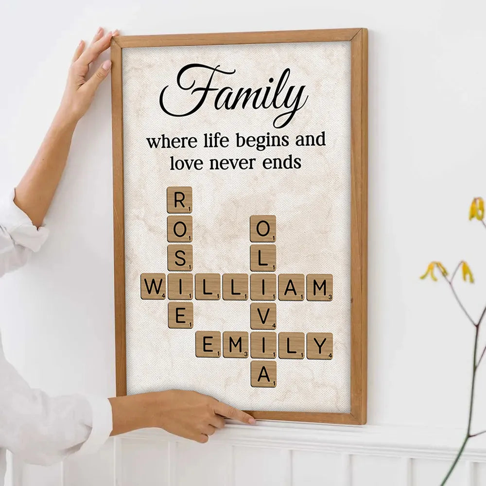 Family Where Life Begins and Love Never Ends Personalized Poster – Custom Crossword Wall Art, Heartfelt Gift for Any Home