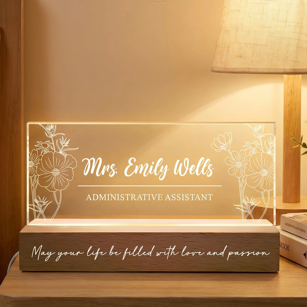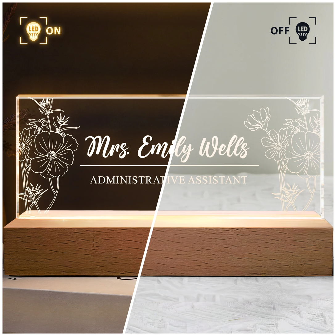 Personalized Block LED Light Plaque Desk Name Sign with Floral Design – Warm Office Night Light & Unique Gift for Coworkers or Boss