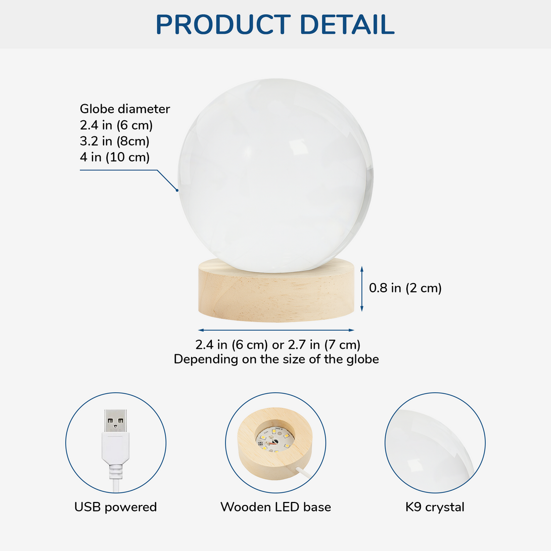 - Material: K9 crystal globe, wooden base, LED light & string