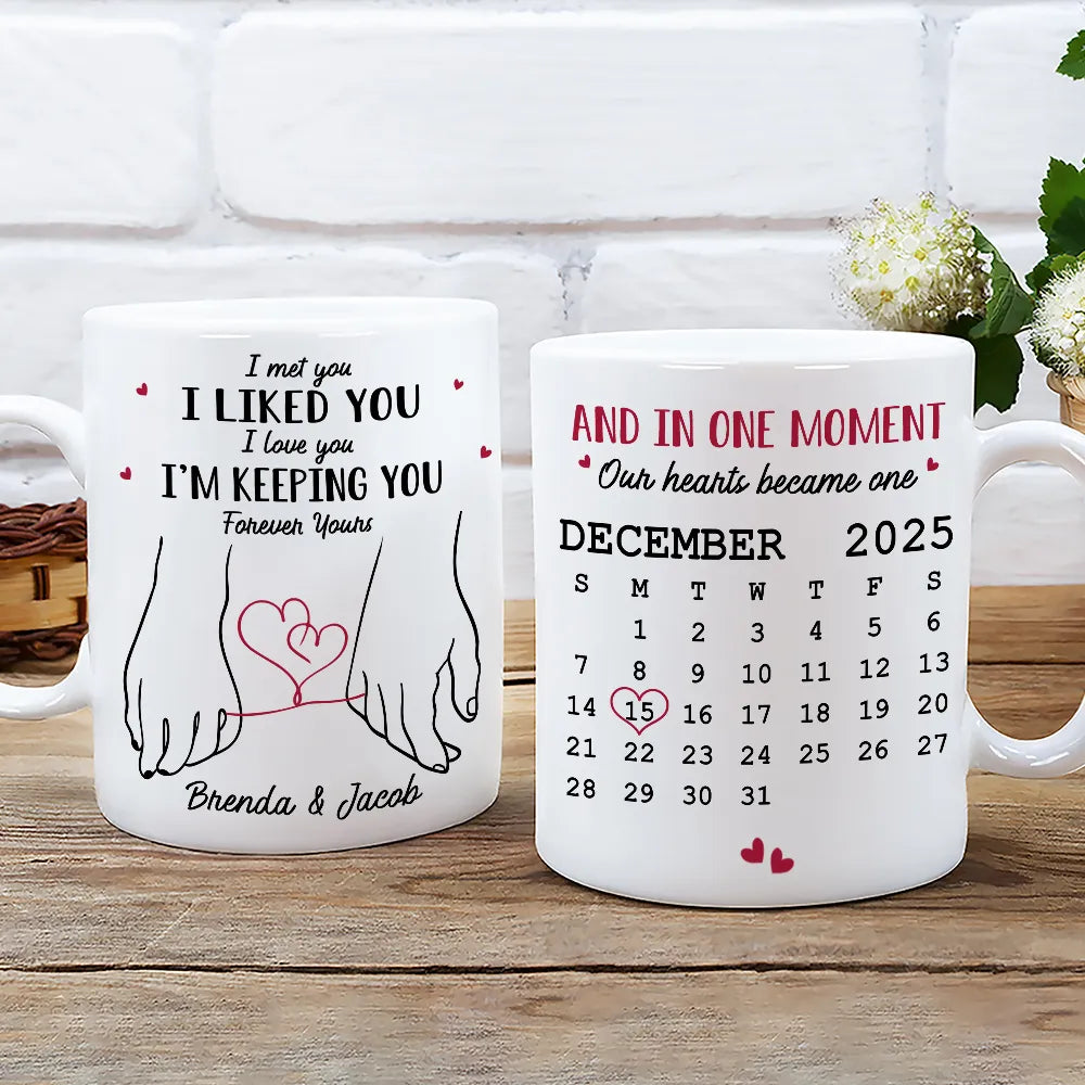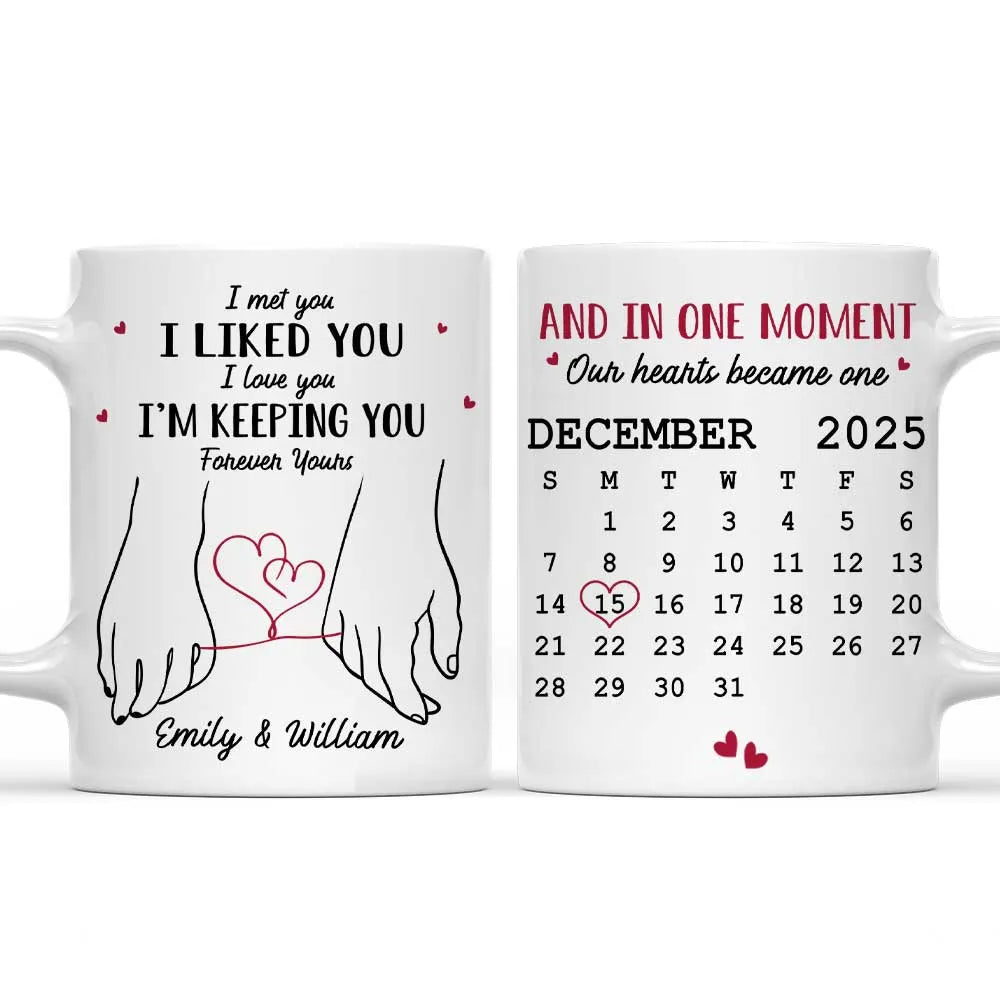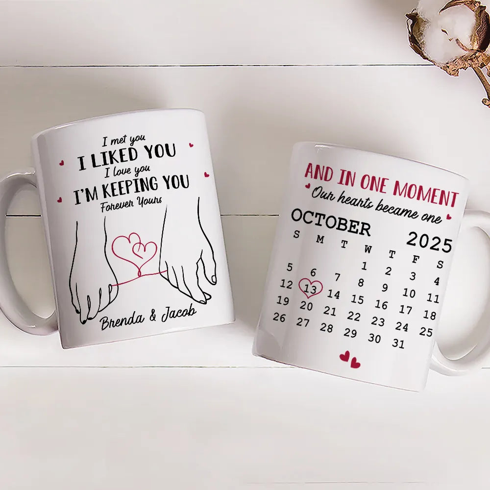 The fun and cute holding hands line art, tiny hearts, and calendar layout make this mug feel stylish yet meaningful. It looks great on a desk or kitchen shelf and makes every morning coffee or daily tea a little reminder of your favorite person.