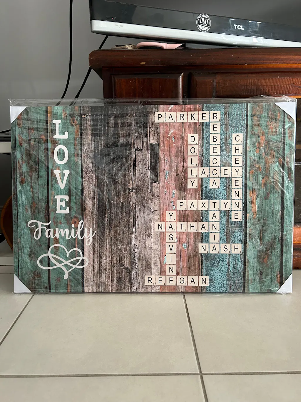 This personalized family name crossword poster is a beautiful way to showcase the bonds that make your family special. Each name is thoughtfully placed in a crossword-style arrangement, set against a rustic wooden background, creating a warm and inviting piece of wall art. The words "Love" and "Family" add a heartfelt touch, making this poster a perfect symbol of unity and togetherness.