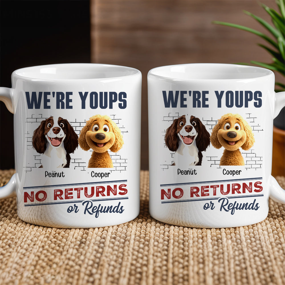 Delight dog aficionados with a high-quality ceramic 'We’re Yours, No Returns or Refunds' mug, a durable and dishwasher-safe choice. This personalized cup, ideal for couples and pet lovers, brings humor to every sip, ensuring a long-lasting and smooth experience. Perfect for any beverage or as a unique gift surprise, it's a staple for a dog lover's collection.