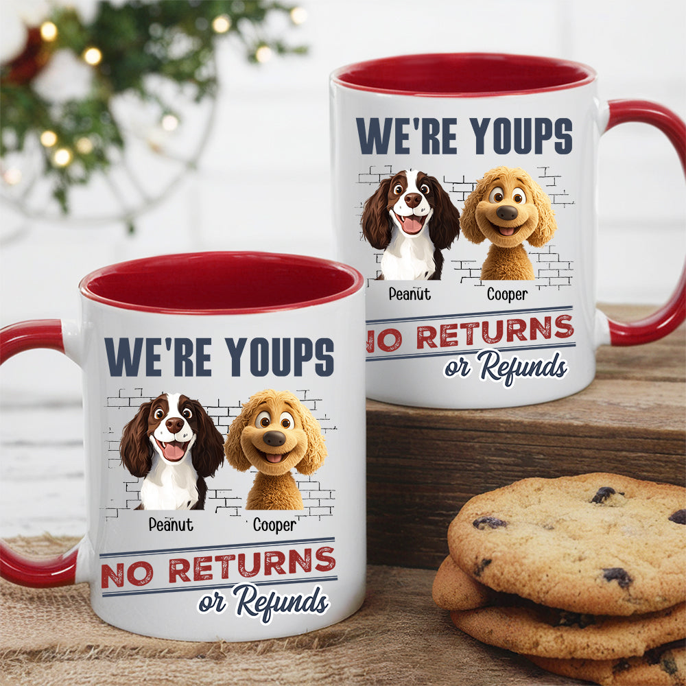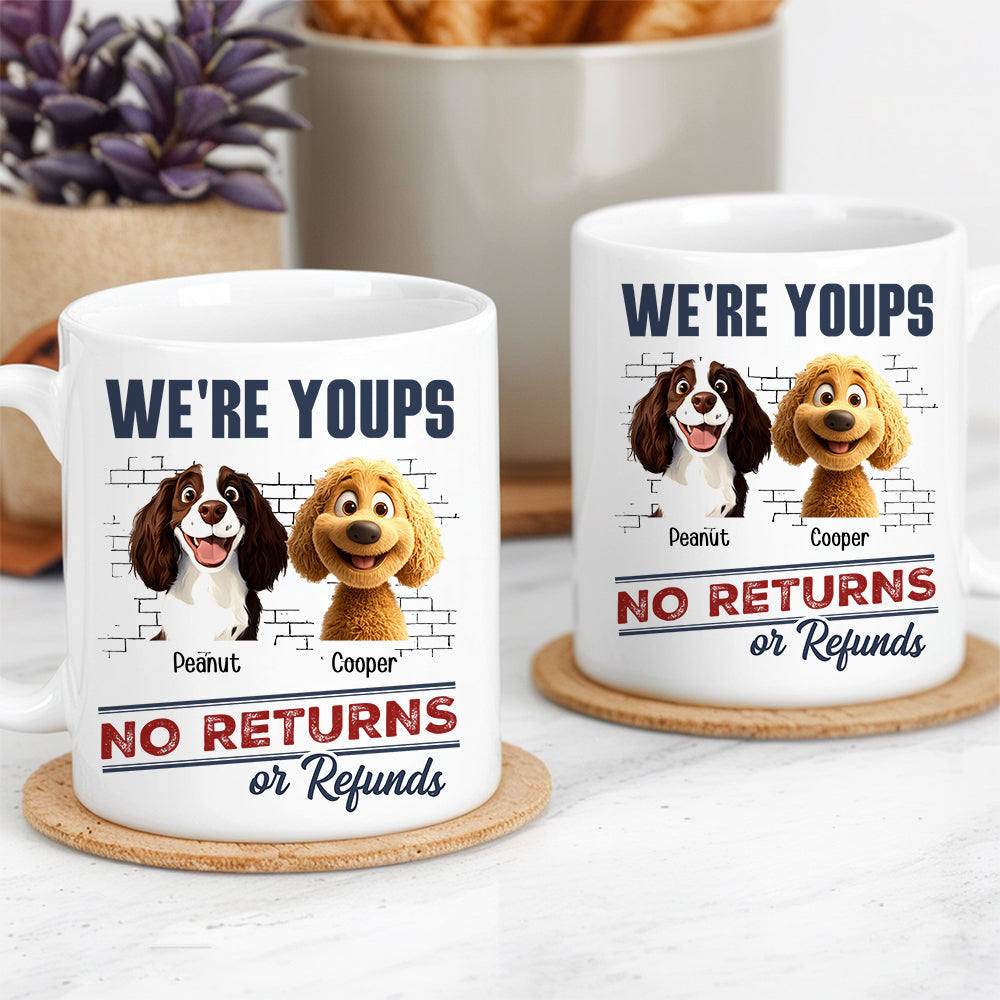 Surprise dog lovers with a unique, personalized mug featuring a playful 'No Returns or Refunds' dog-themed design. Crafted from high-quality ceramic, it's the ideal gift for couples or friends with a love for pets. Durable and dishwasher safe, this custom mug celebrates the human-pet bond in a humorous way, making it perfect for coffee or tea breaks on Christmas, Valentine's Day, or any special day.