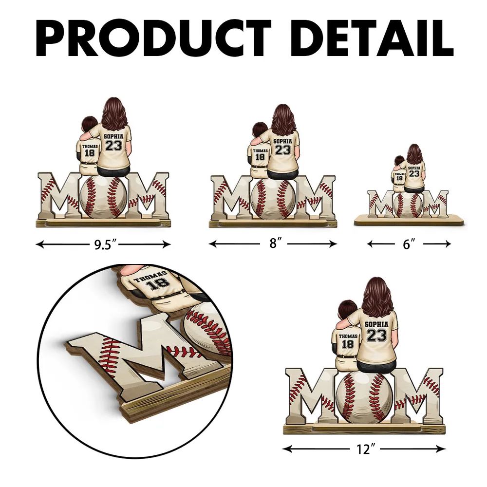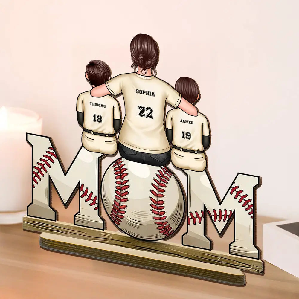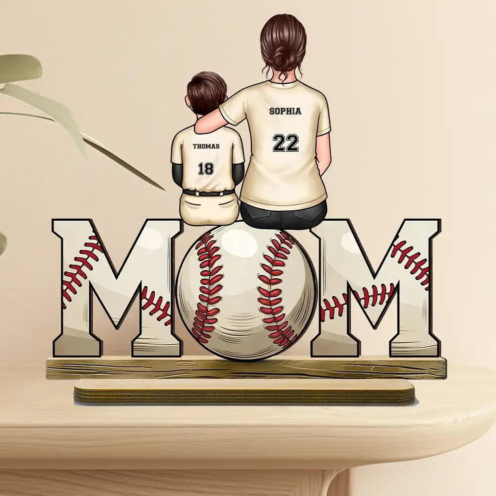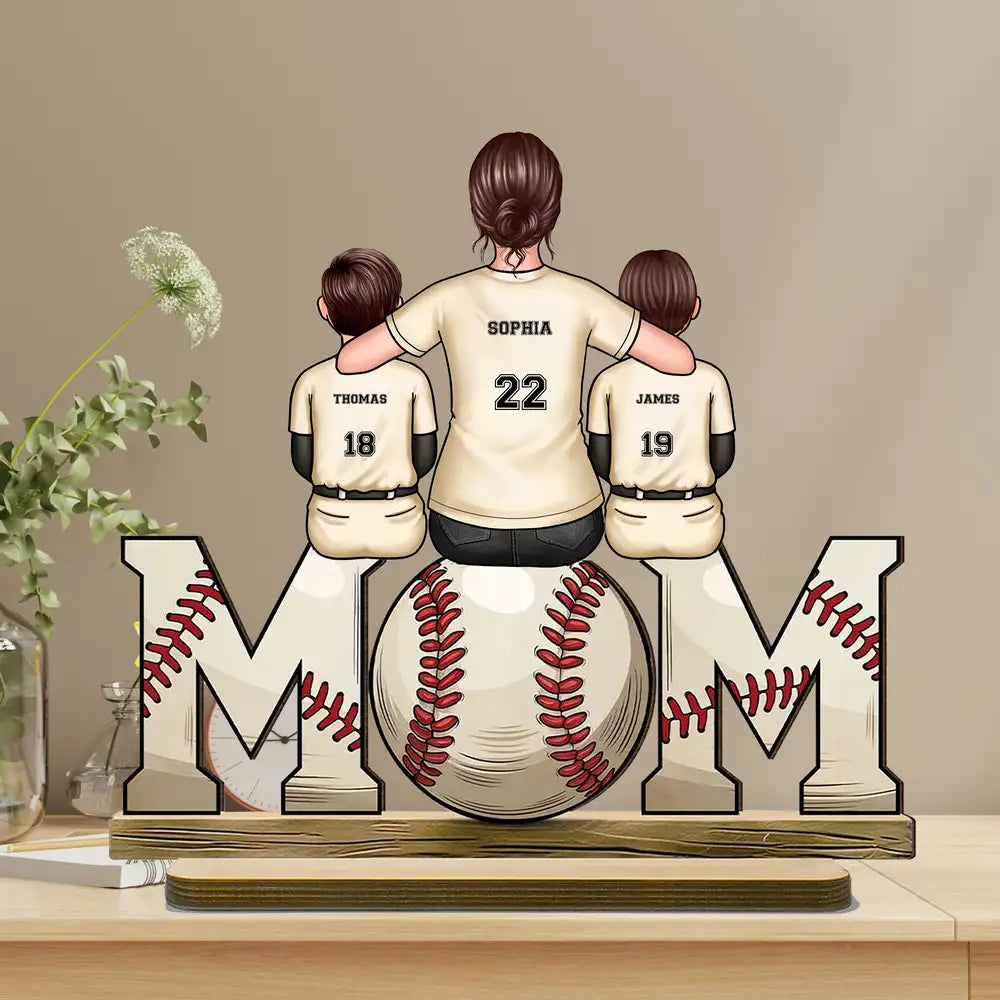 This personalized wooden plaque celebrates the beautiful bond between mother and children. The design captures a special moment with the mother and son wearing matching baseball jerseys, making it a heartfelt tribute to mom.