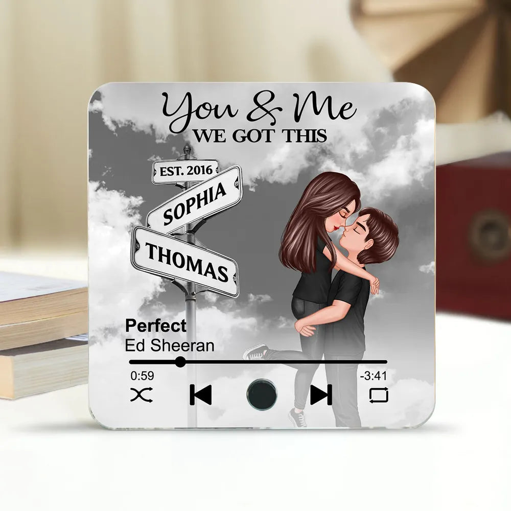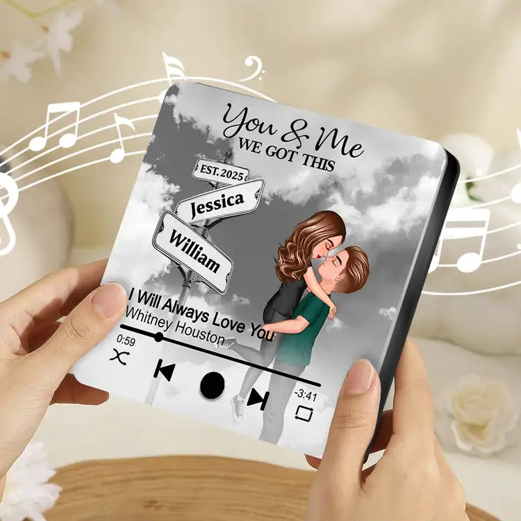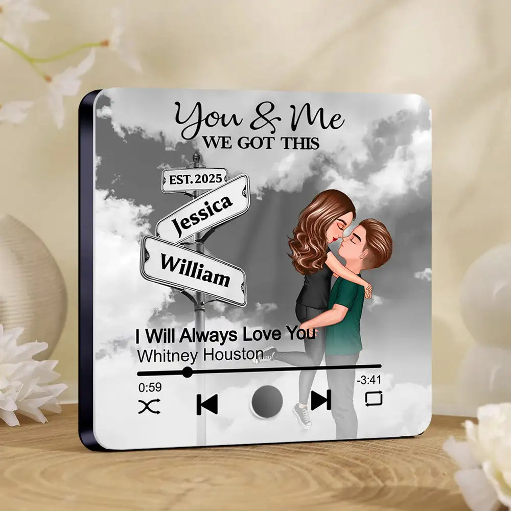 Declare your unity! The phrase “You & Me – We Got This” crowns a sweet kiss illustration and custom street-sign names. Add your special song and established year to turn this acrylic magnet into a daily echo of the love that carries you through everything.