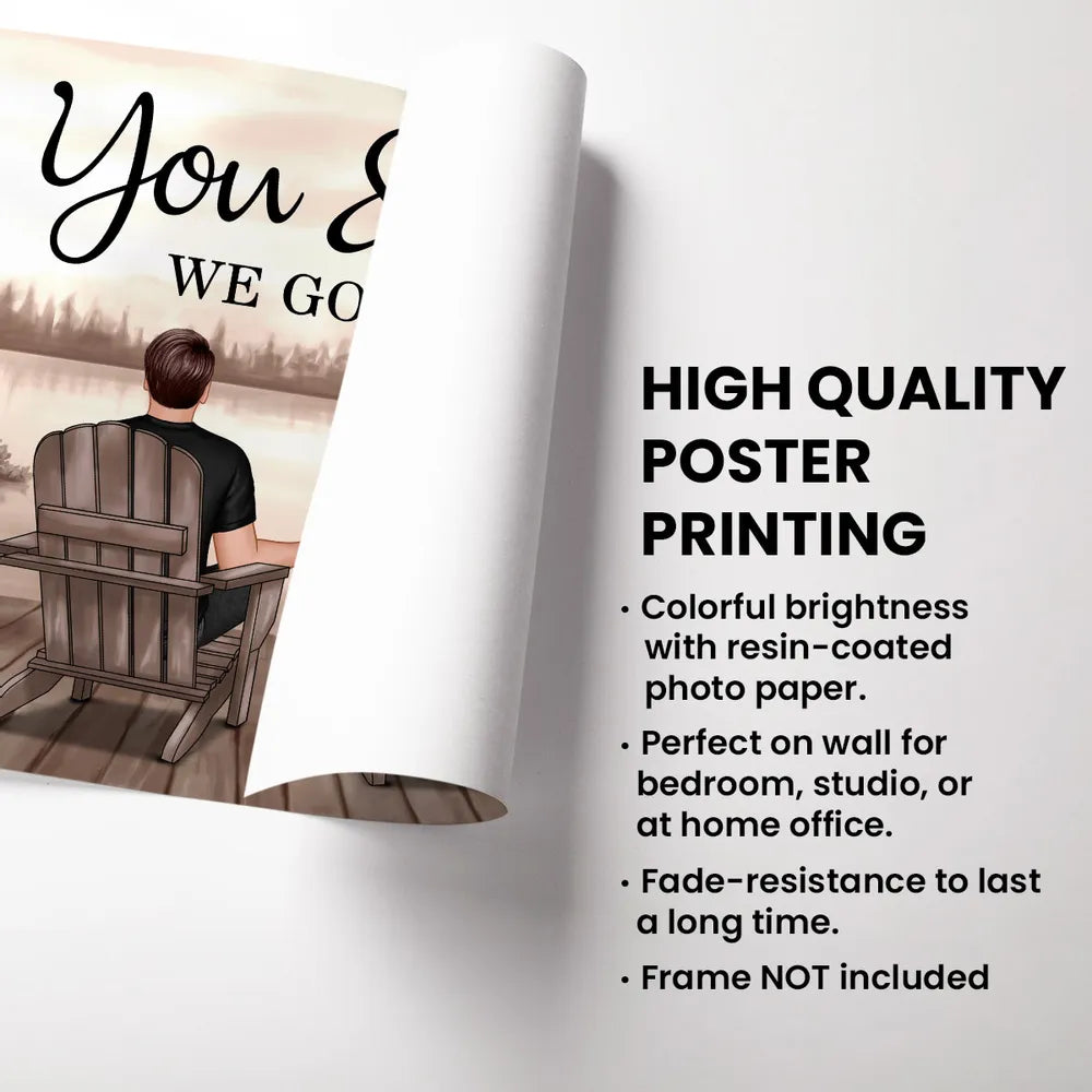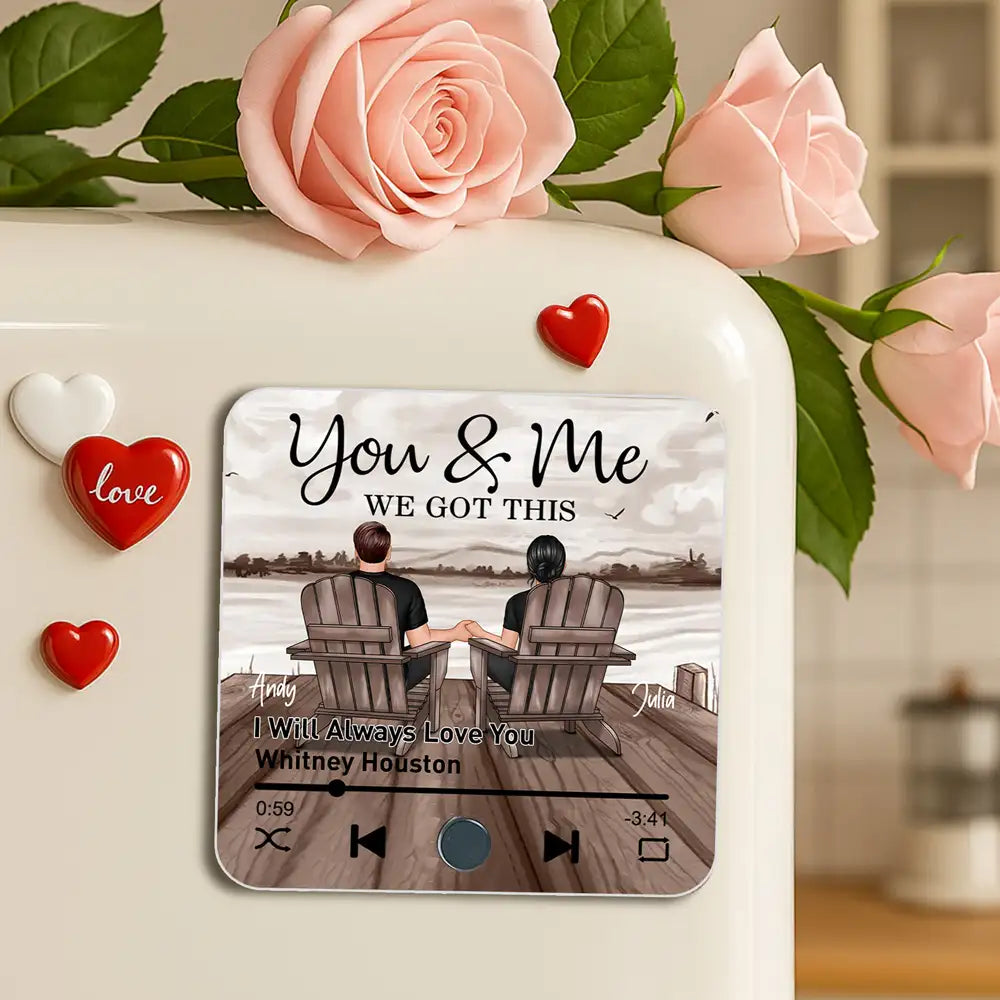 Bathed in the glow of the setting sun, this custom poster shows a couple seated on the beach, arms around each other. With the words “You & Me – We Got This” and personalized names, this artwork is a reminder of your enduring love and commitment.