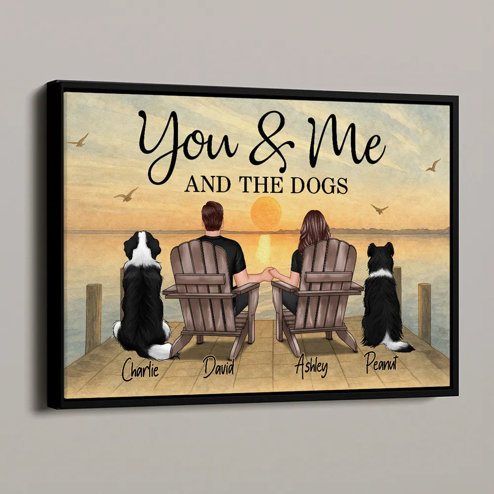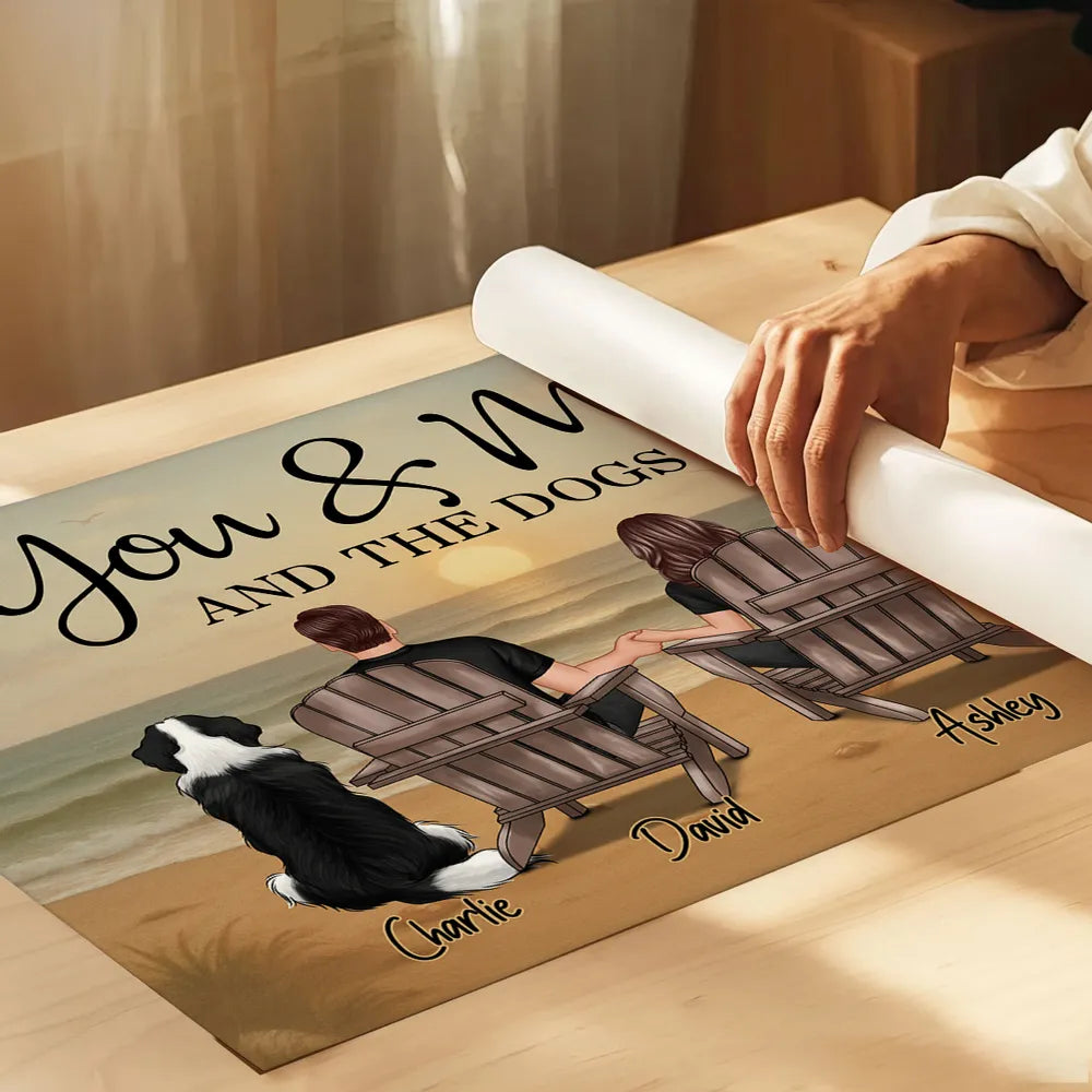 "You & Me and the Dogs – Customizable Couple Poster with Pets, Personalized Beach Scene"