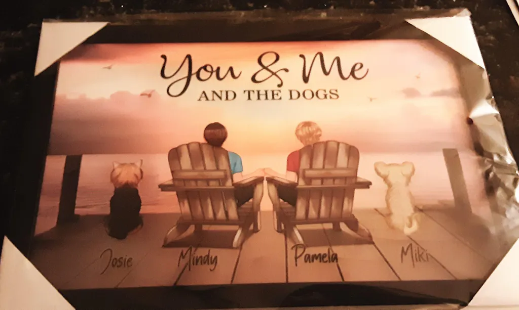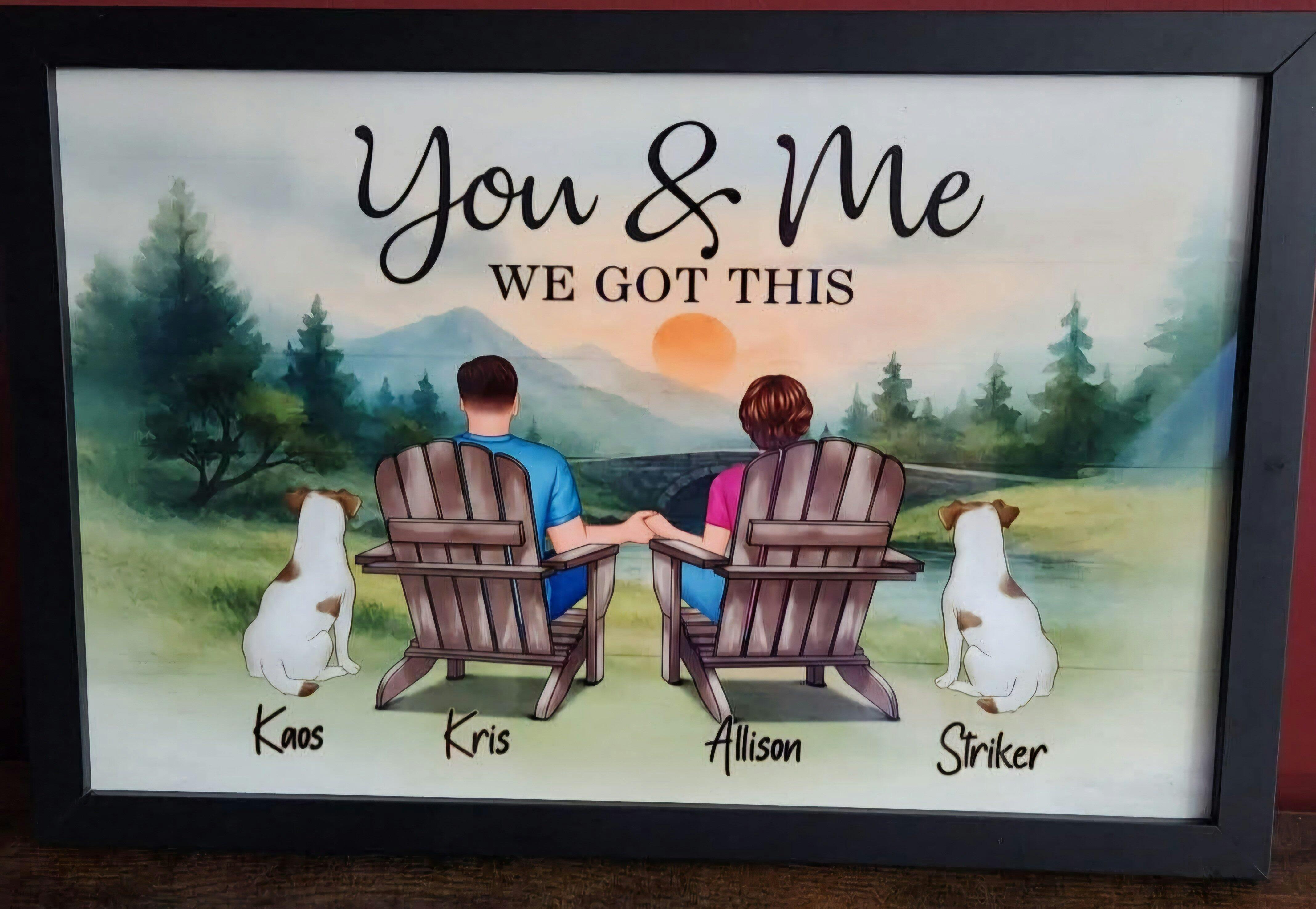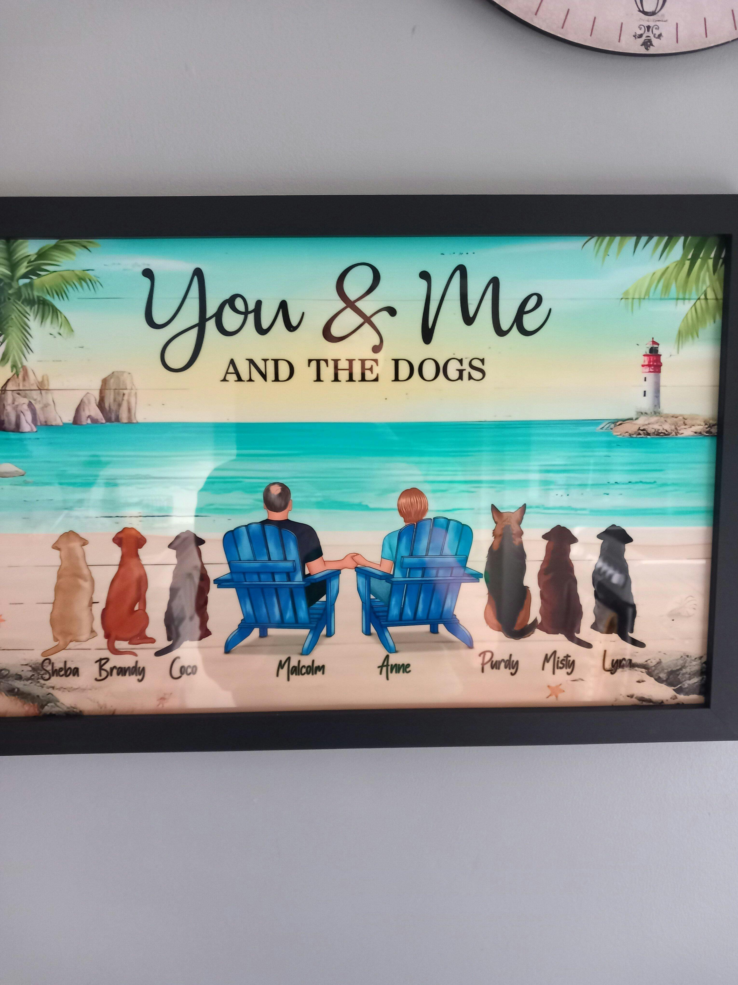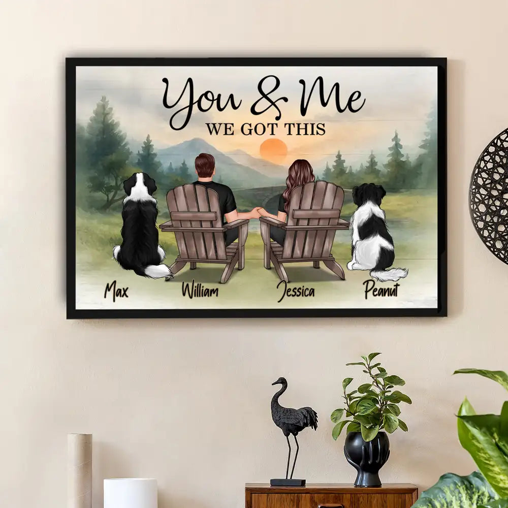 Celebrate the love between you, your partner, and your furry companions with this "You & Me and the Dogs" personalized poster. The design features a stunning beach scene with the playful quote “You & Me and the Dogs – We Got This,” along with two Adirondack chairs and your beloved pets by your side. This piece beautifully captures the essence of love shared not only between you and your partner but also with your pets!