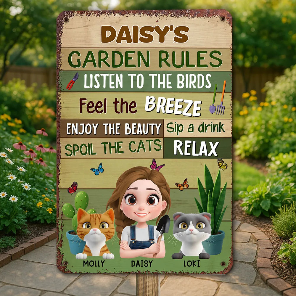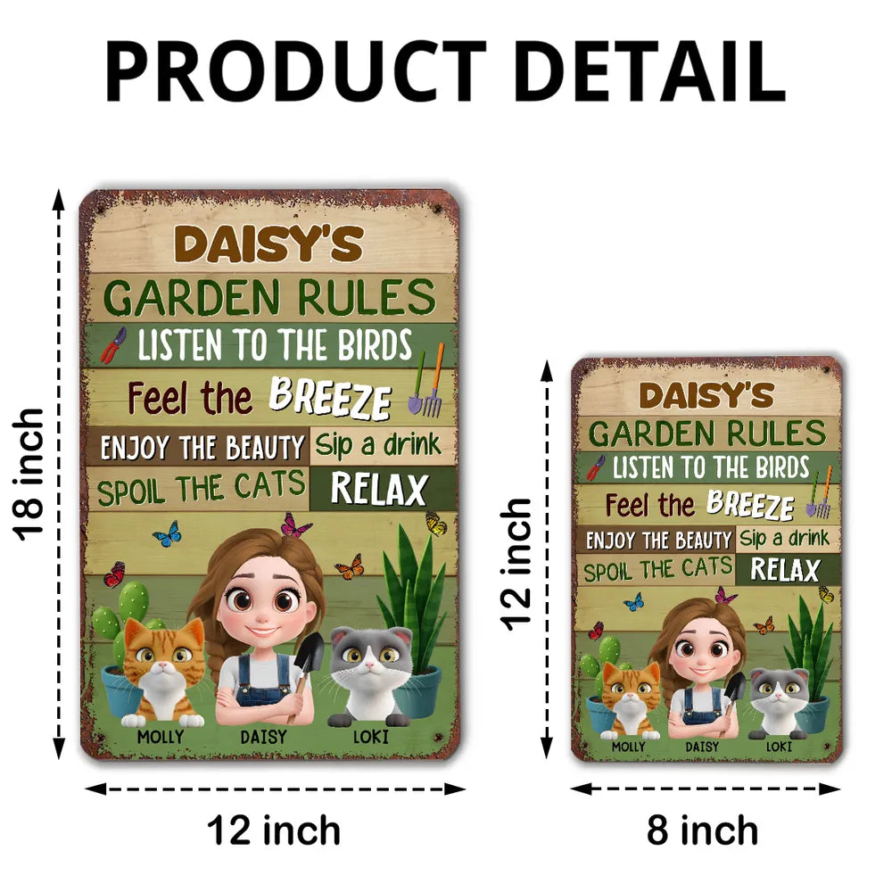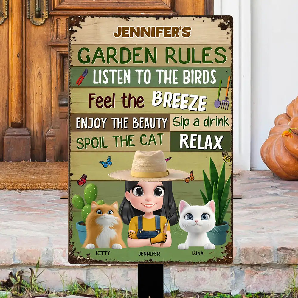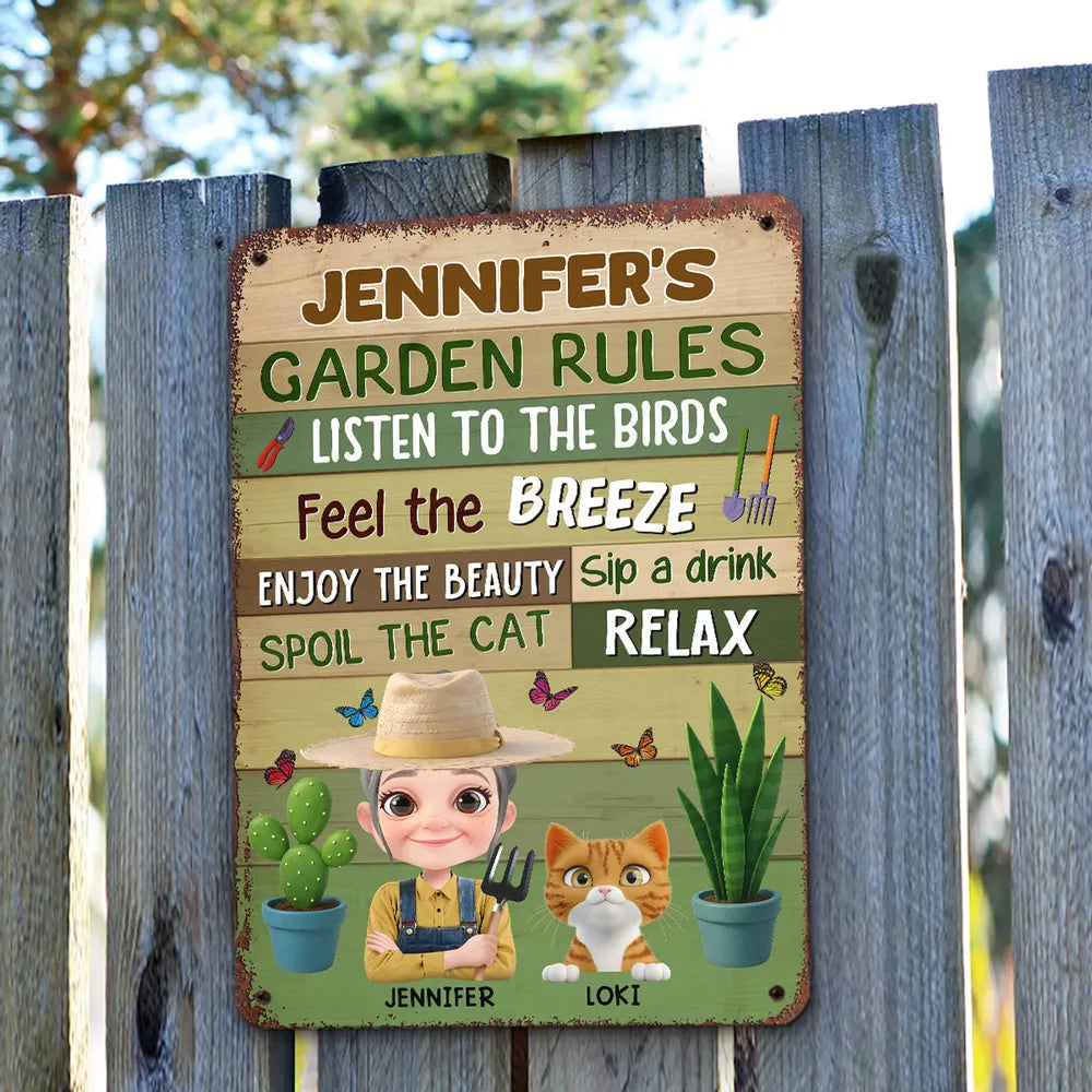 Garden Rules Metal Sign – Personalized Rectangular Iron Sign for Plant Lovers and Cat Moms