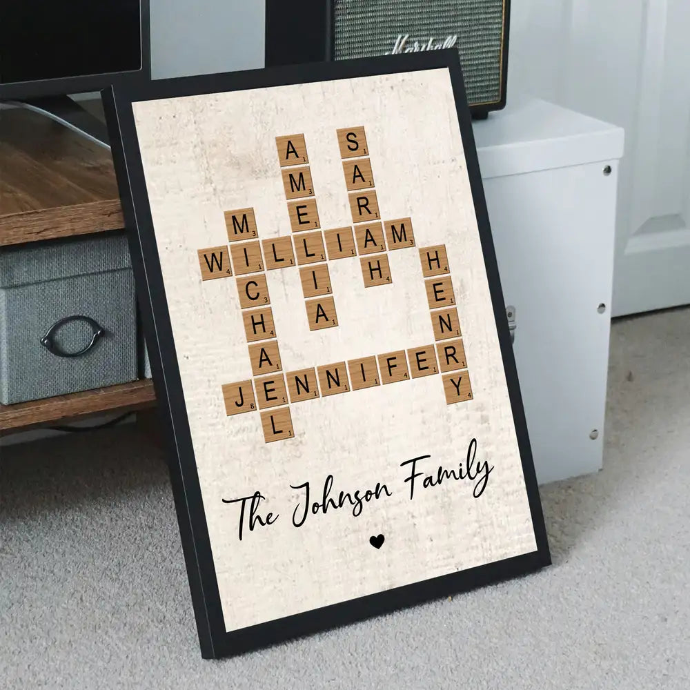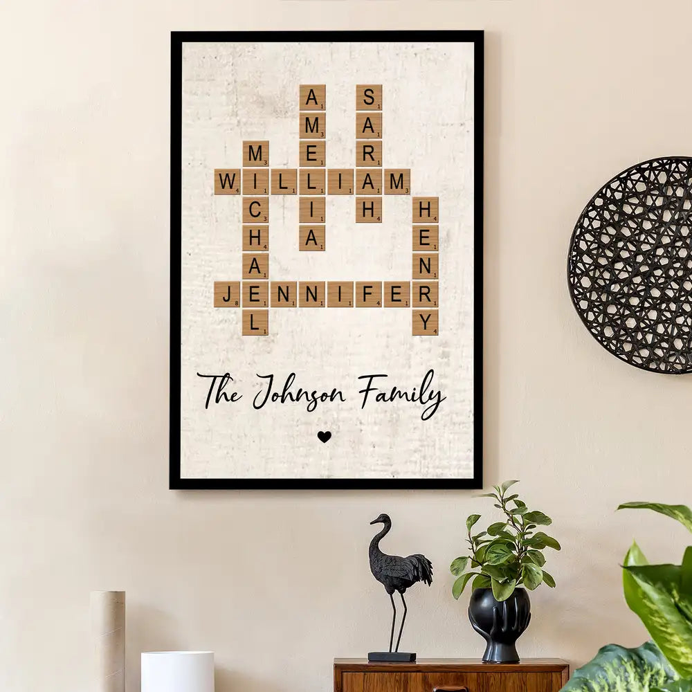 Celebrate the beauty of family with this personalized crossword puzzle poster. Featuring the names of each family member in a unique scrabble-style layout, it symbolizes the importance and interconnectedness of family. This custom family poster is a perfect way to show love and connection through art, making it an ideal gift for family reunions or as a home decor piece to cherish for years.