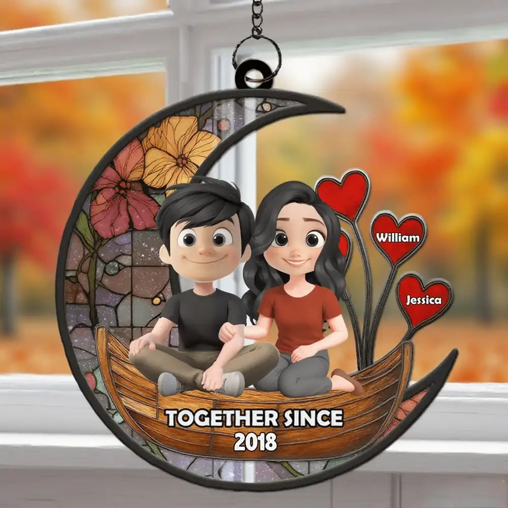 Celebrate the love journey with this beautifully crafted "Together Since" ornament. Featuring a couple sitting in a wooden boat within a crescent moon, surrounded by floral stained-glass details, this design symbolizes warmth, commitment, and the special memories you’ve shared over the years.